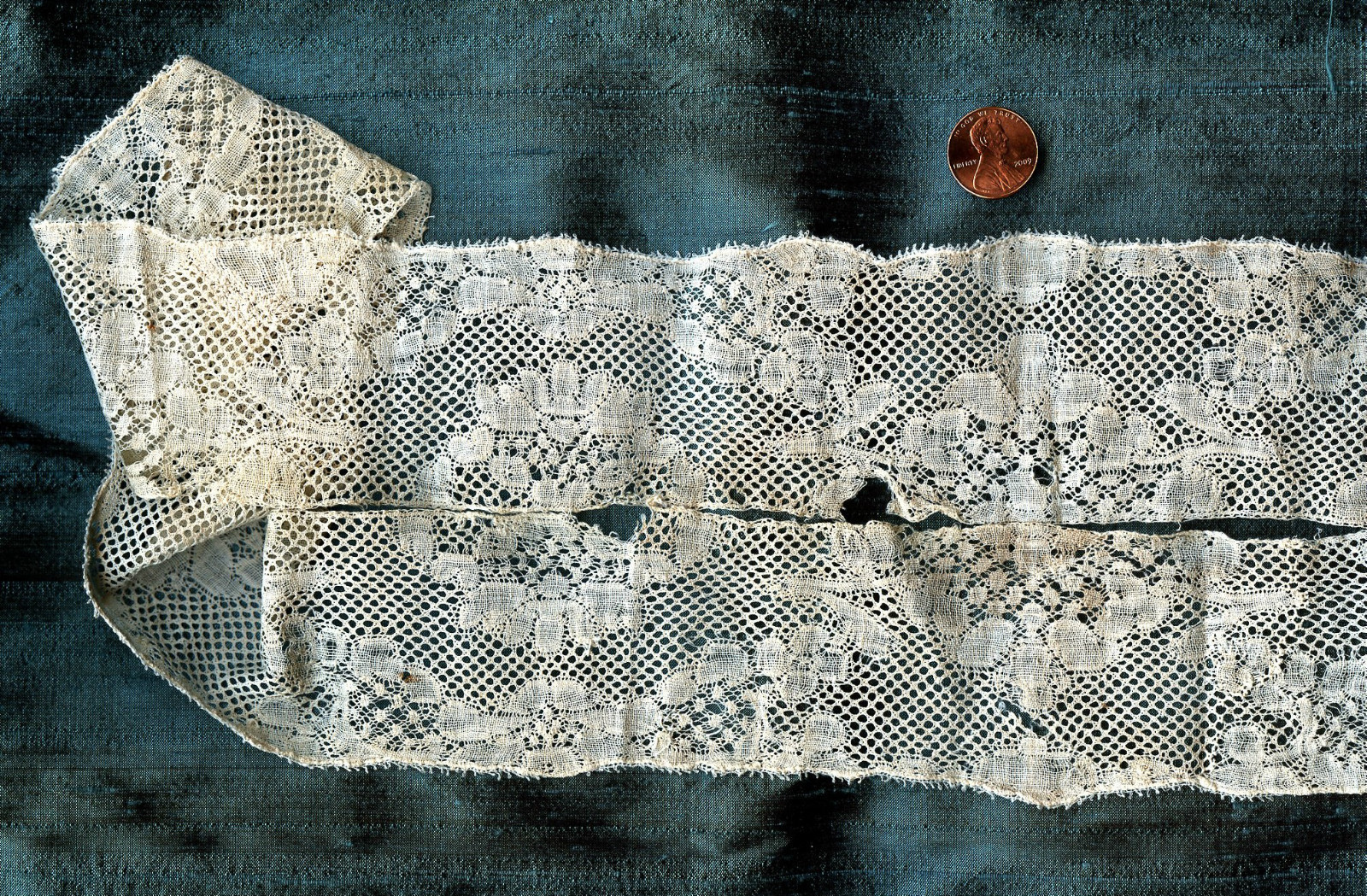 Comments: Another Mezzo Punto piece, and an interesting comparison to the one reviewed above. Here the tapes are more obvious, and the raised edges seem a little clunky. Still, enough survives to make this a good way to study how the raised edges were executed in the early Italian laces. I won’t guess as to exact origin, but I don’t see obvious reasons to steer away from Italy. The piece has been greatly altered, but ignoring that the lace is somewhat on the low side of good in condition.