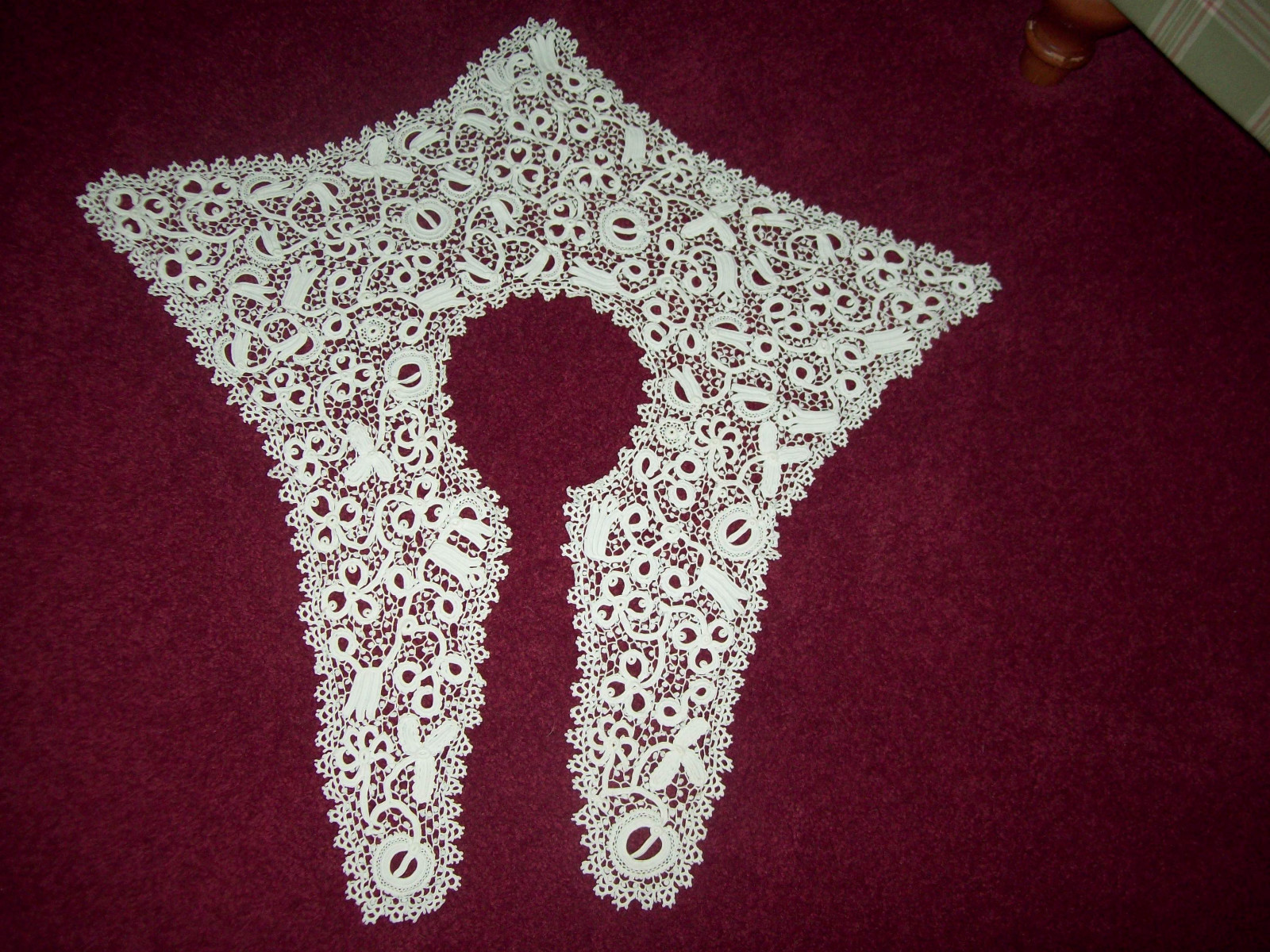 Comments: An Irish Crochet shawl collar. Tightly worked motifs of shamrocks, pinwheels and flowers. Ever notice how Irish crochet is almost always arranged with three lobed motifs? The picots looked crocheted, not Clones knots, but it’s a bit hard to tell in the photos. No particular symmetry to the design, but it works nicely. Looks in overall very good condition.