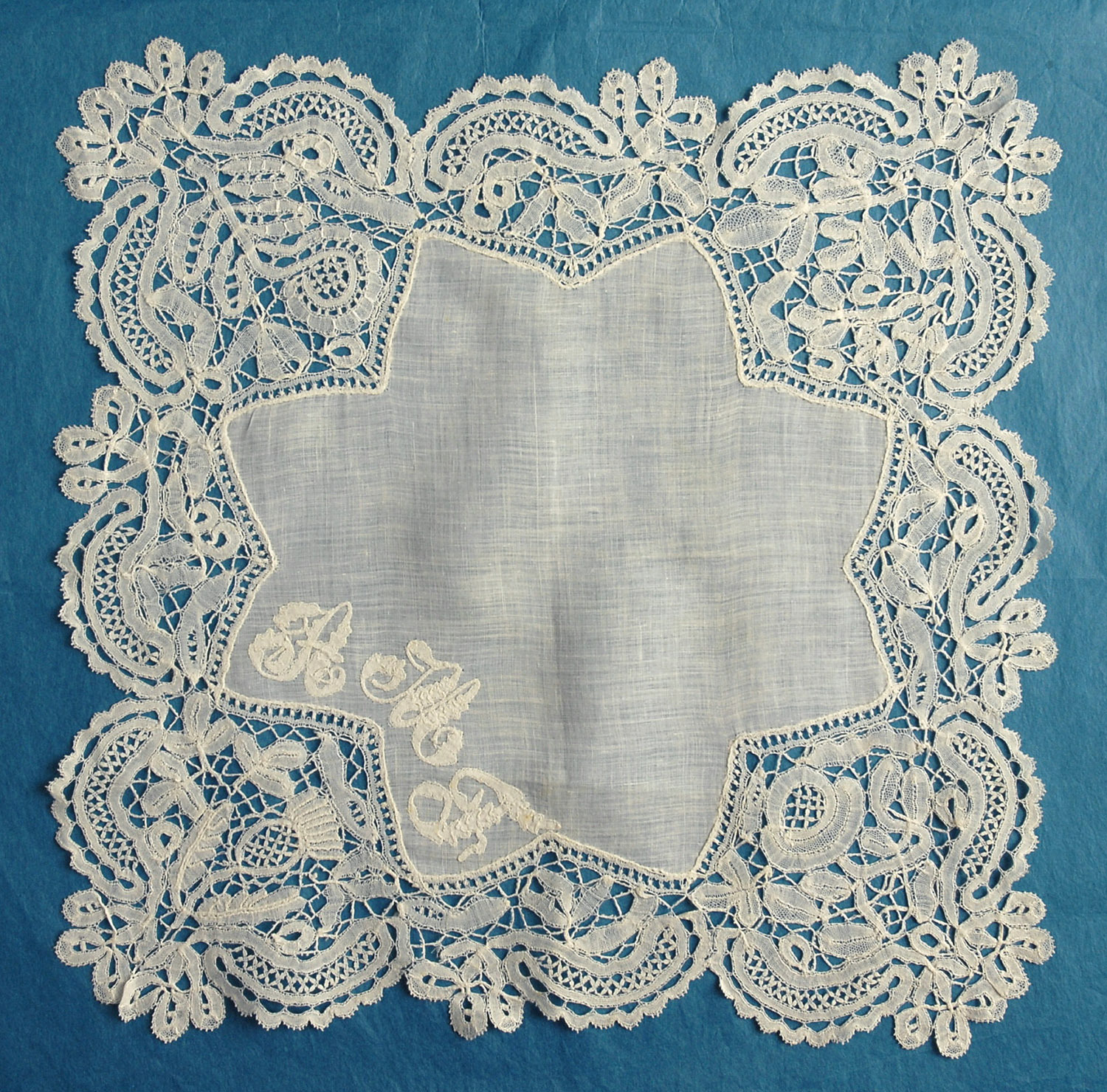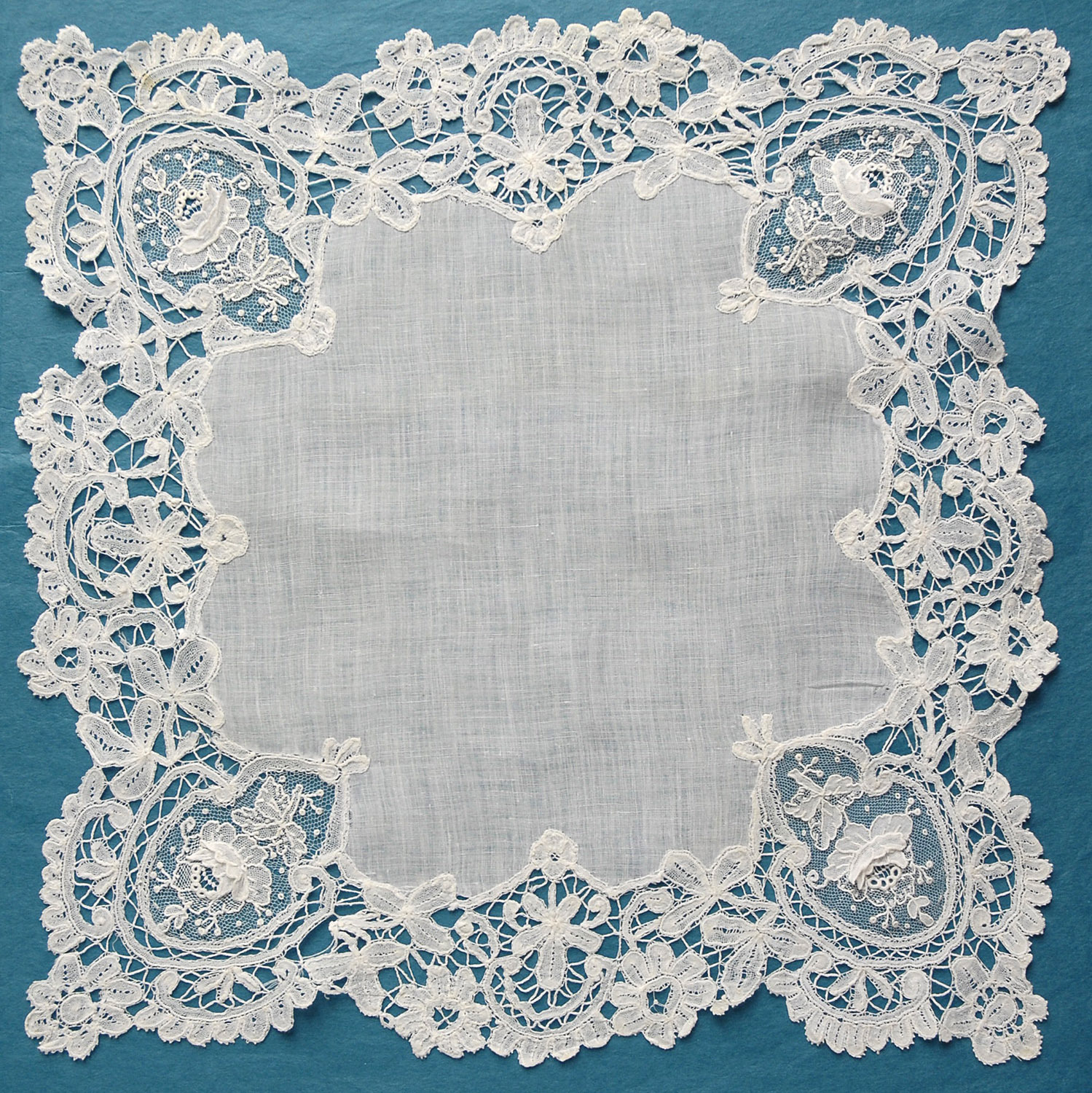 Comments: A Brussels Duchesse handkerchief with raised petal rose Point de gaze inserts. The bobbinlace is a bit on the Bruges side, simple gimp outline, no raised work. a few tiny holes in the needlelace mesh and some loose and broken brides. Seller indicates the piece has recently been washed. Basically good condition.
