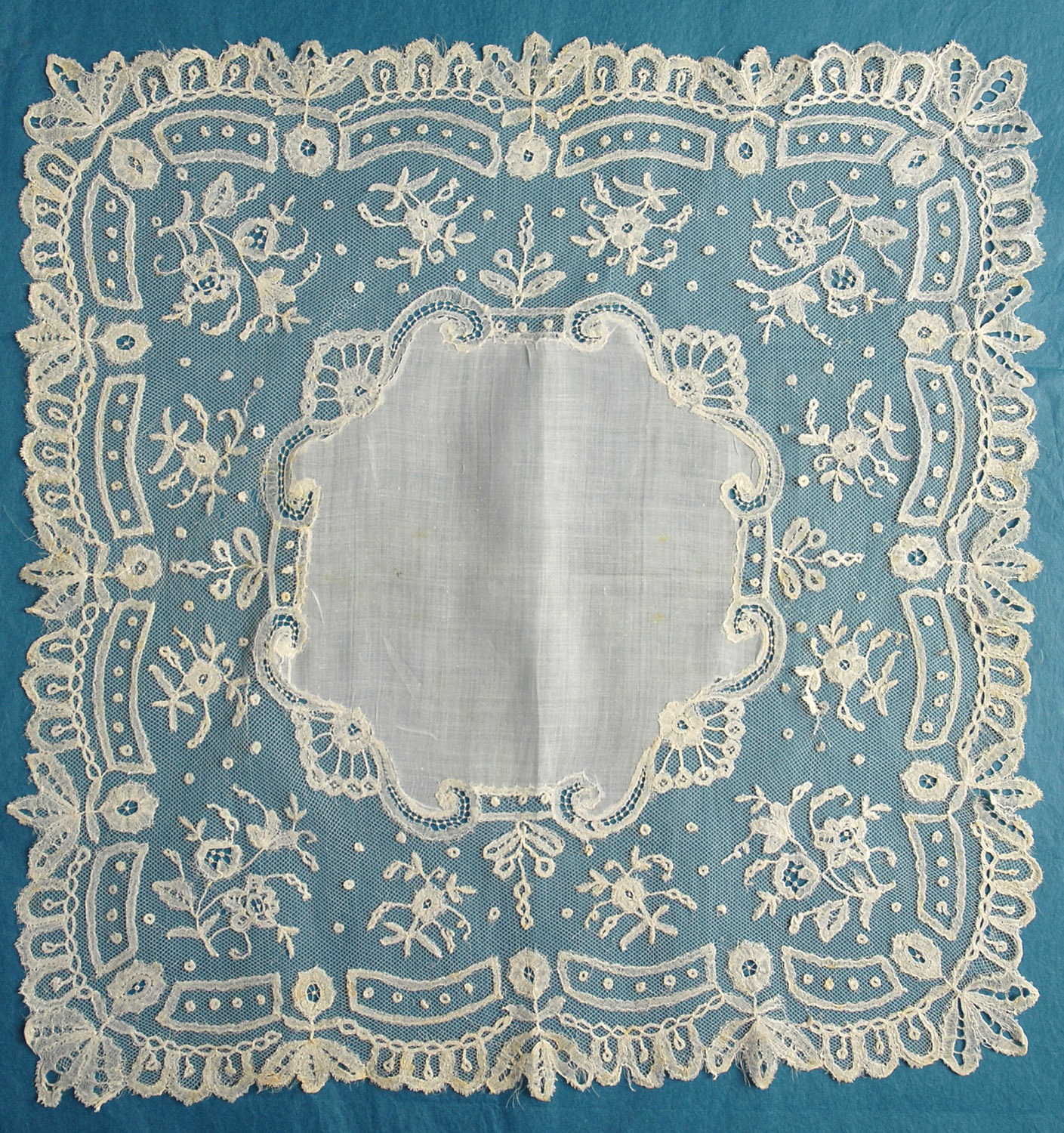 Comments: A handkerchief of Brussels bobbinlace application on machine net. Includes a few small needlelace fillings for simple accents. It is a fairly large piece, typical of handkerchiefs made of this kind of lace. The motifs are fairly simple with a good pattern. A little frayed, some pulls in the tulle, some pinholes and a few tiny repairs. Generally good condition.