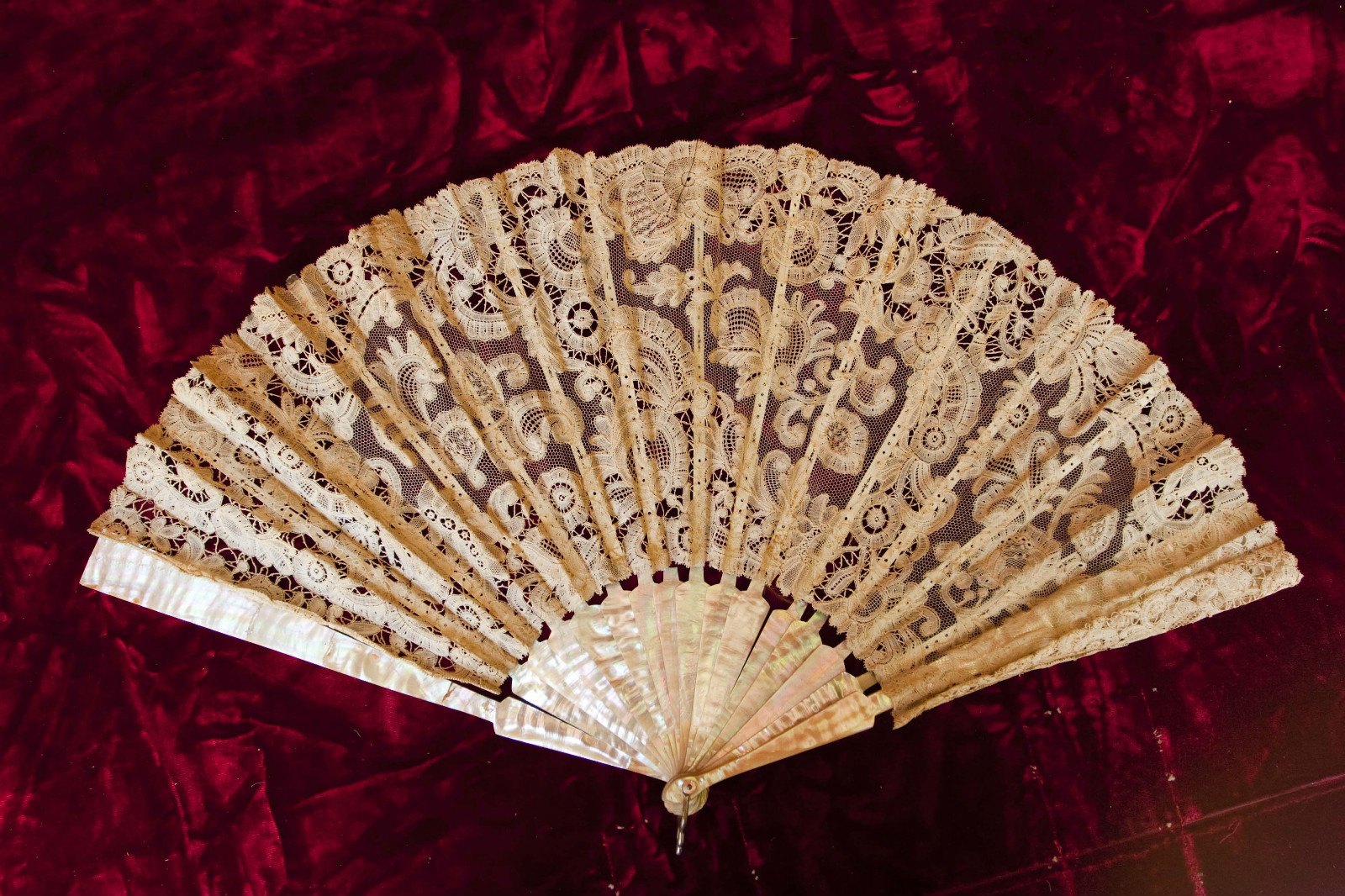 Comments: An interesting fan with Mother of Pearl sticks. The lace is almost a Point d’Angleterre – well done bobbinlace motifs with what looks like a Point de Gaze ground. At the same time it crosses over into the usually coarser Point de Milan, which has both bride and needle-made grounds. Here the bobbinlace is nicely done with bobbin-made fillings, while you would expect more needlelace ‘modes’ in Point d’A. The lace looks in basically very good condition, I don’t see any obvious problems in the photos. The sticks are badly broken.