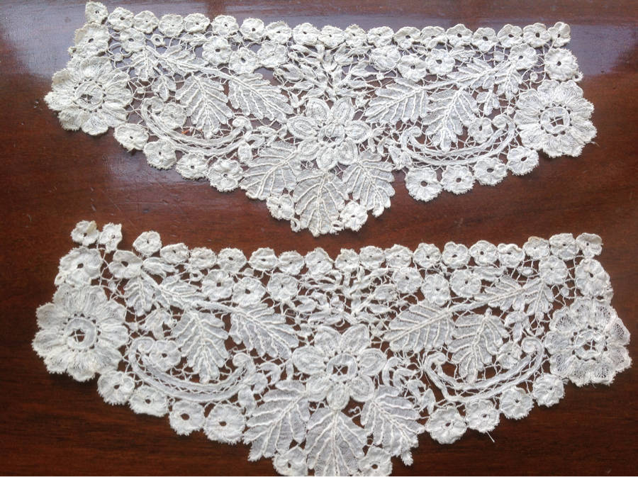 Comments: A pair of Duchesse de Bruges cuffs, no needlelace additions. Typical Duchesse design, some raised work in the veining. A few broken brides and separations along the edges, and a bit of a wrinkled washed look; generally good condition
