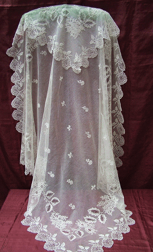 Comments: A needlerun embroidery mantilla. A very dense stitch pattern meant to imitate blonde, and it does a very good job of that. Some pulls in the tulle, a few separations along the edge, and a little edge fraying. Basically good condition.
