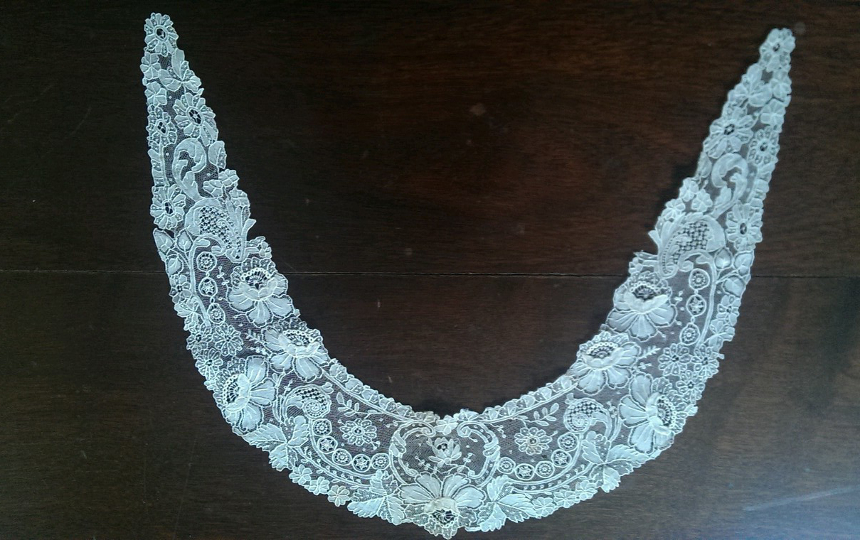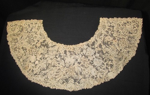 Comments: A collar of Duchesse de Bruxelles. Raised petal roses in the large center Point de Gaze insert, the two end inserts are flat. The bobbinlace is a little on the Bruges side, quite flat with a simple gimp outline. The bobbinlace is basically good condition, the needlelace has some rather sizable holes in the needlelace mesh. The entire piece is a little short of good condition.