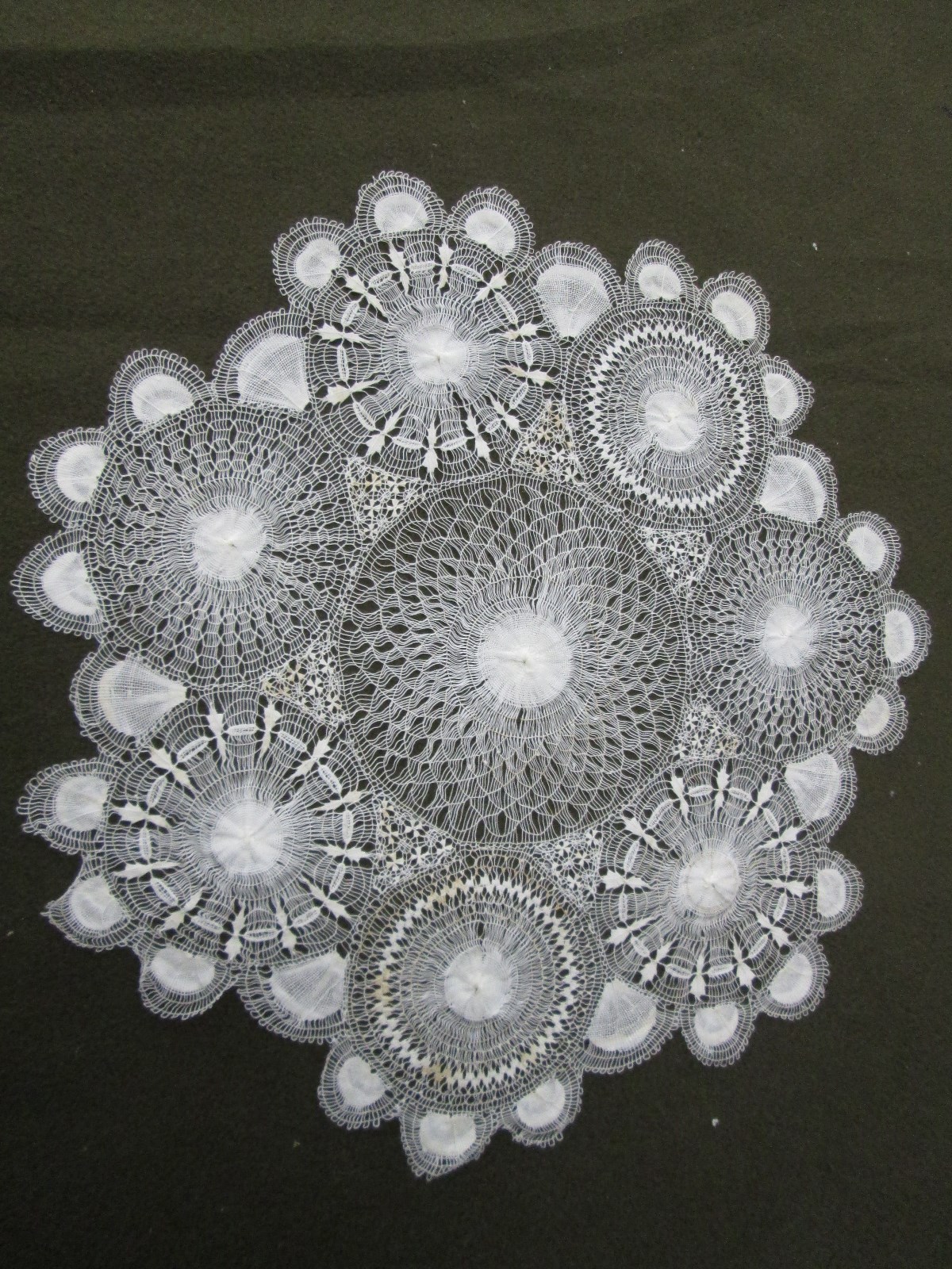 Comments: An interesting ñanduti doily with palmetto border, 4 different roundels, and grid joins. I like the sunburst central motif. Find thread, carefully worked. Occasional stain, basically very good condition.