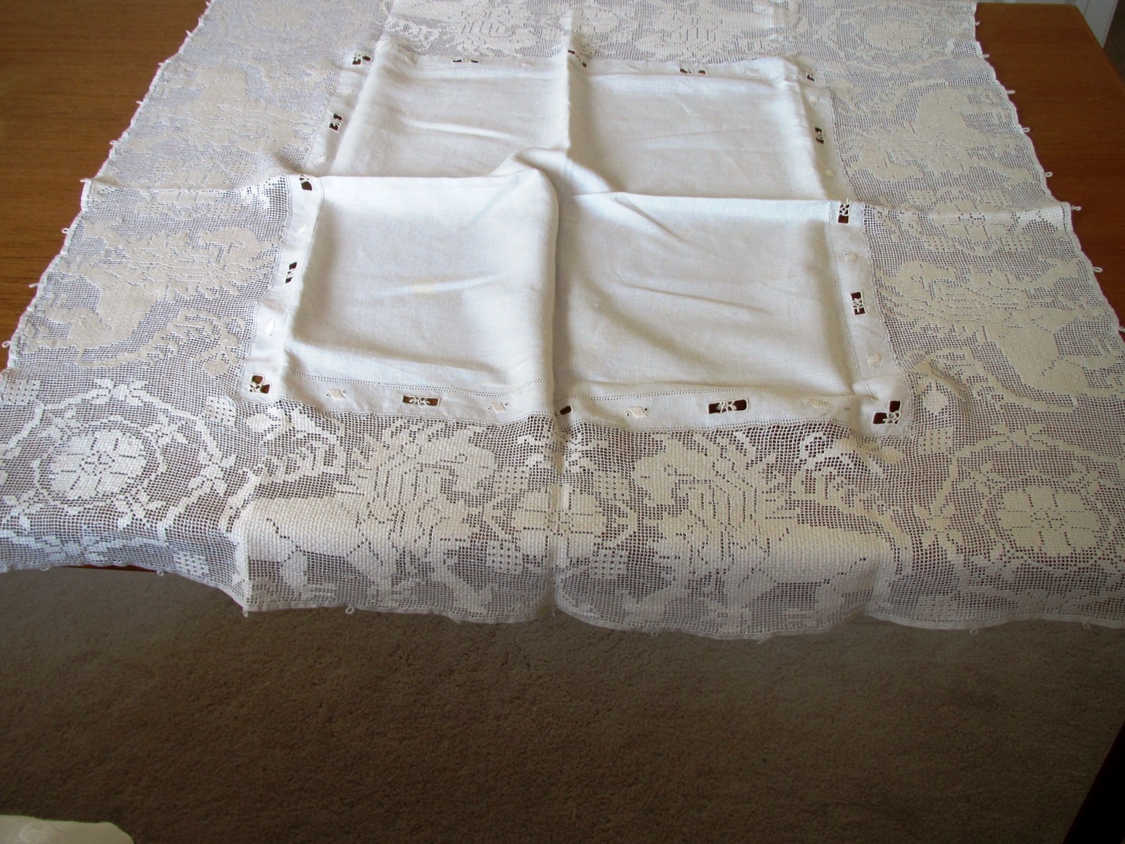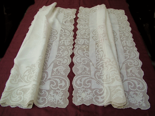 Comments: The border on this cloth is an embroidered net, but I’m not exactly sure how the net was made. It’s not Burato, which is embroidery on a leno weave. This one looks like a drawnwork with the remaining rectangular lattice of threads whipped over. Some cutwork and drawnwork in the center cloth. Probably a Sicilian product, note the little looped picots on the edge, typical of that kind of work. Looks in very good condition.