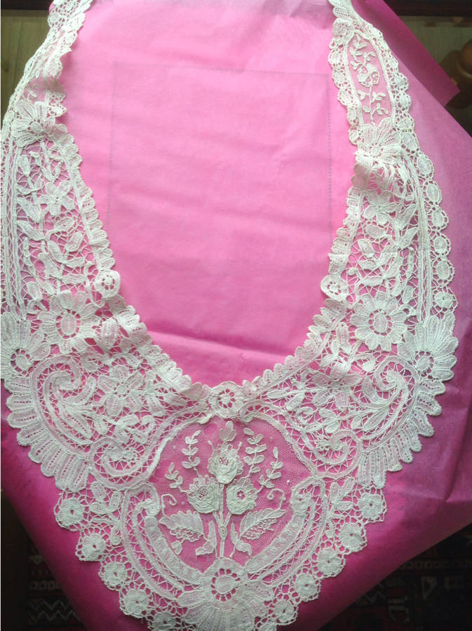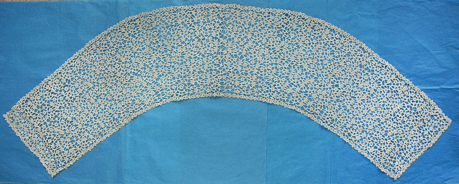 Comments: A deep Carrickmacross guipure collar. Note the straight picots along the edge, and the lack of ‘Irish’ design elements. This tends to be better quality work in the spectrum of Carrickmacross, and the type is not well document. So we hope it is Carrickmacross. In this piece there’s an unusual cloth transition at the ends, unsure of the purpose. It might be an alteration to lengthen the piece. Occasional loose bride and stain, basically very good condition.