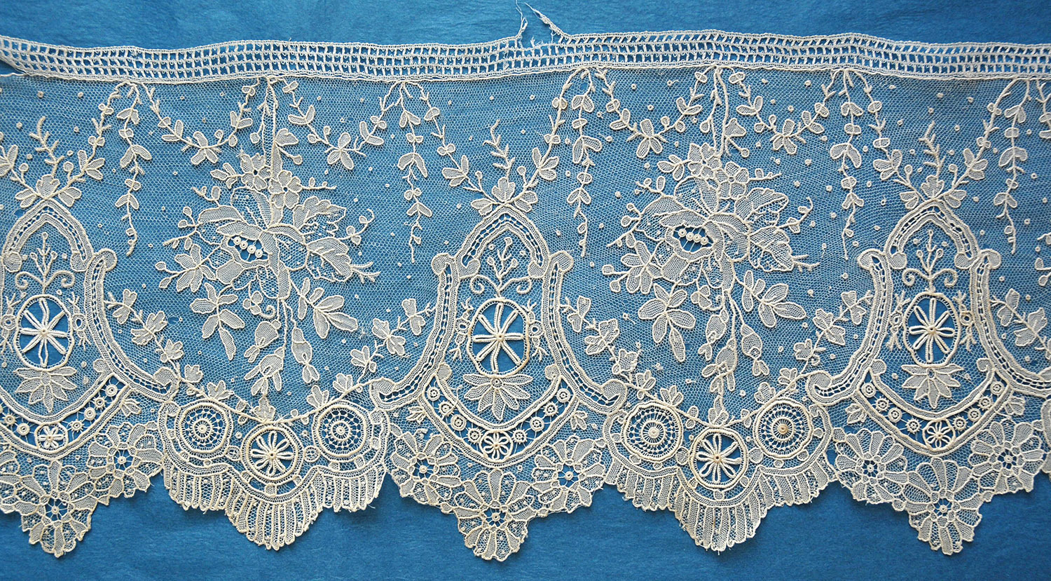 Comments: A collar of Brussels Duchesse. No raised work in the Point de Gaze medallions, but their designs are carefully drawn, and the mesh looks intact. Good design on the bobbinlace, small, carefully worked motifs with raised work. A few minor brown spots, generally very good condition.