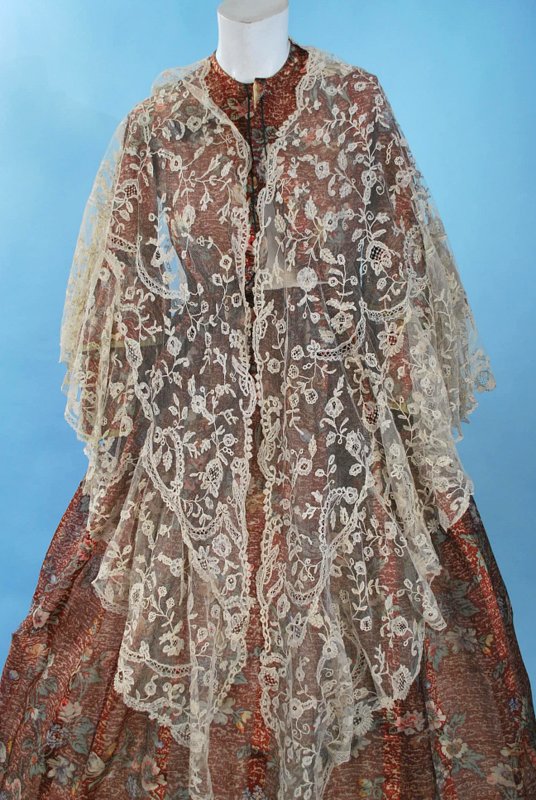 Comments: A shawl with a deep flounce, bobbinlace applique on machine net, with needle-made fillings. The lace is probably Belgian, and the form recalls the Spanish mantilla. Both the center triangle and the flounce look largely intact, although it would help to tell exactly if there was a photo of the entire piece laid flat. The tulle is a bit shredded in places, but localized damage. Some small pulls and breaks along the top edge, a few damaged fillings. It looks quite delicate. Basically good condition.