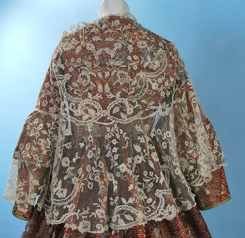 Comments: A black ‘Cantu’ bertha, seller thinks it might be linen. Might be Belgian ‘Rococo’ lace; the hooks and flowerheads don’t flow quite as naturally from the main stems as one would expect in Italian work. The picoted brides are also a little unusual; not to mention the color and thread. Might not be intact on the ends. Basically good condition from the photos.