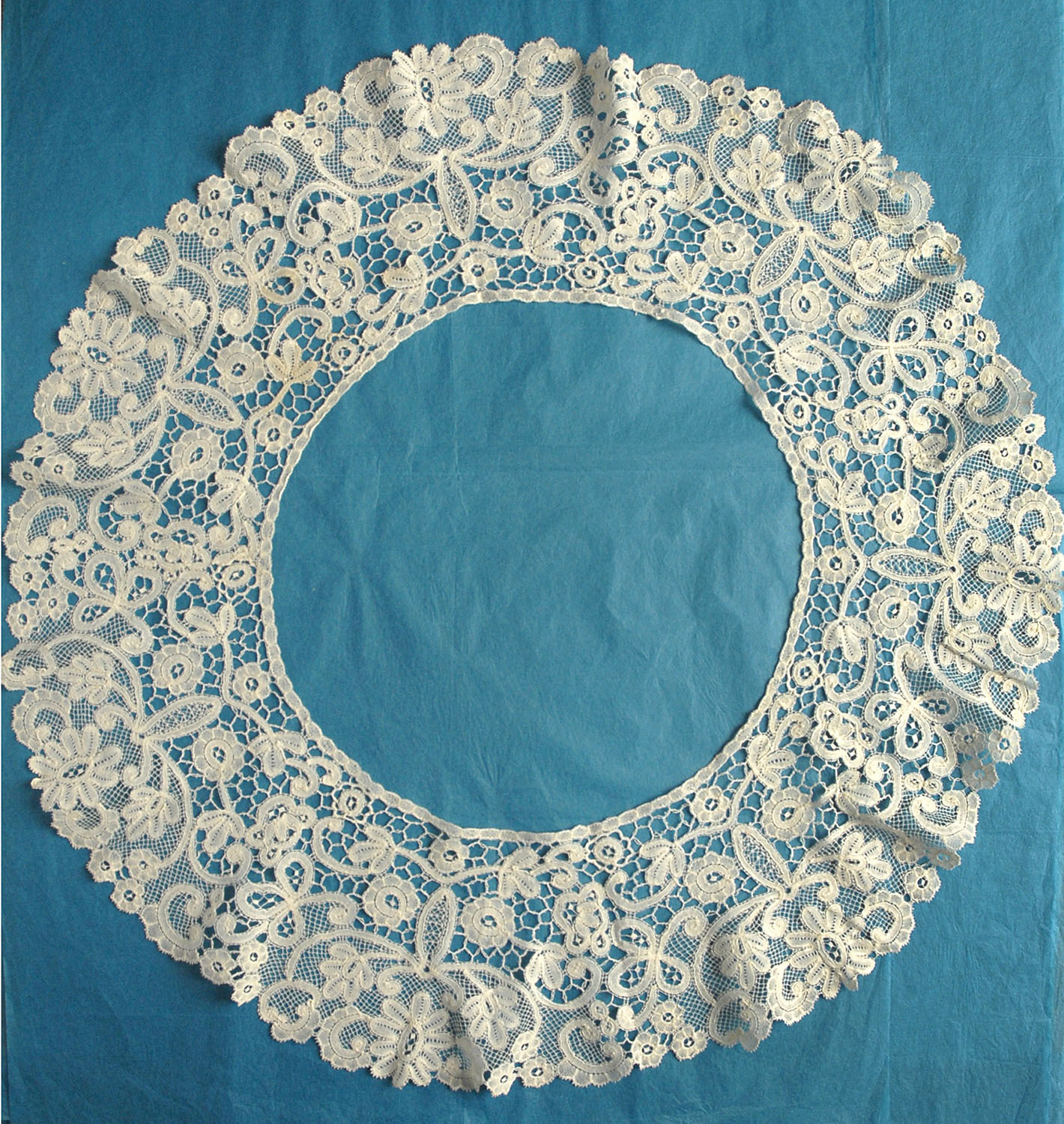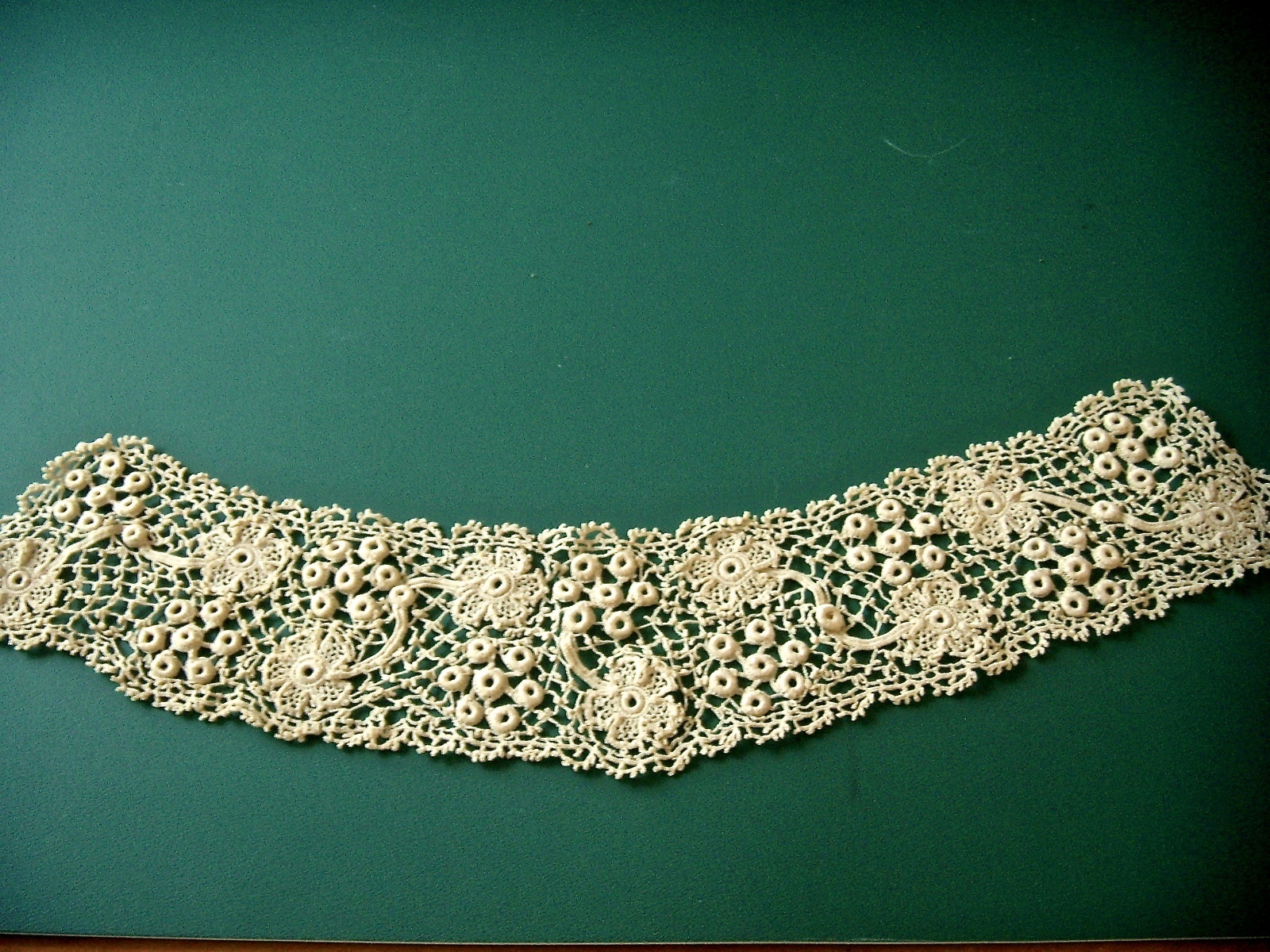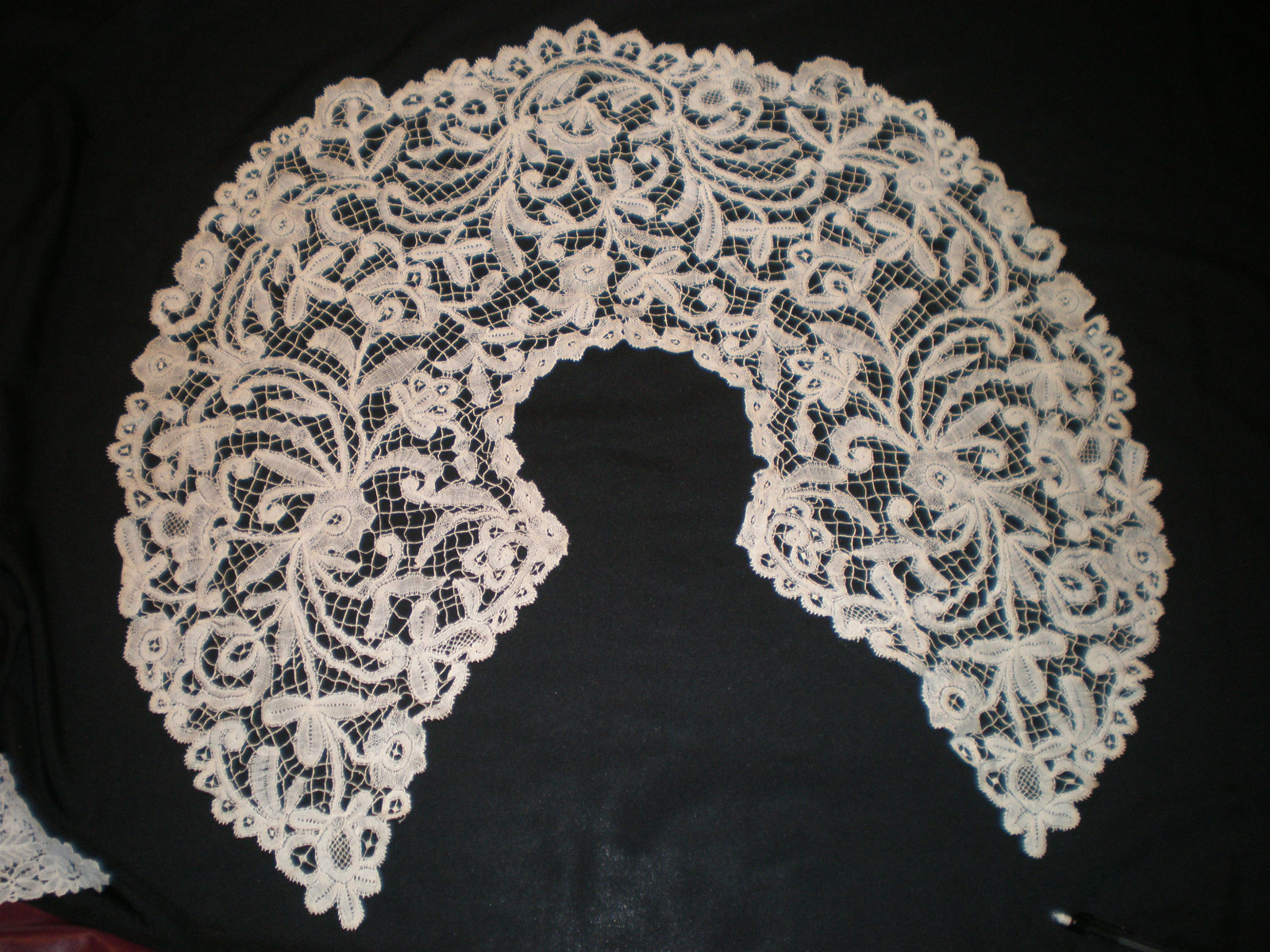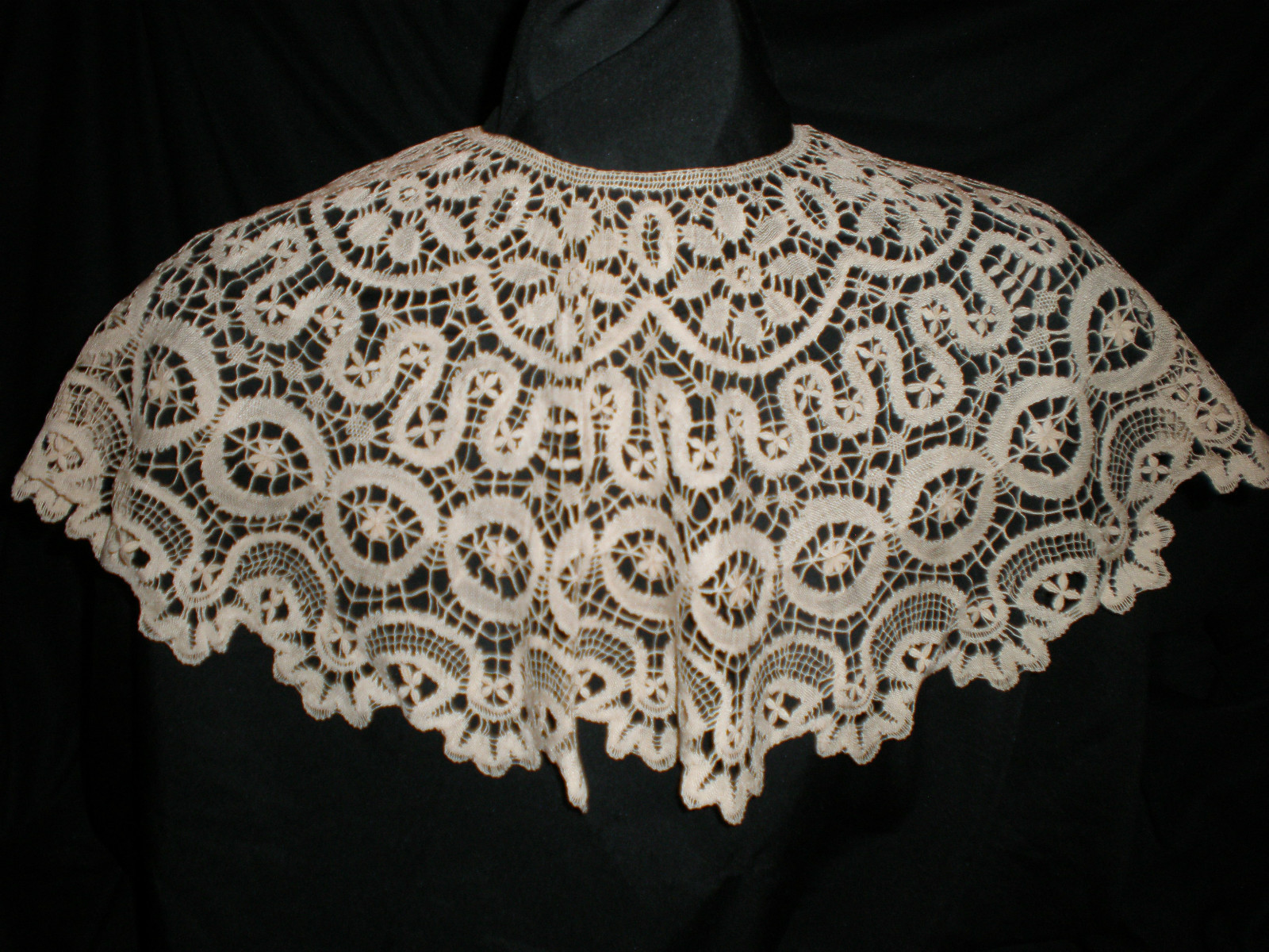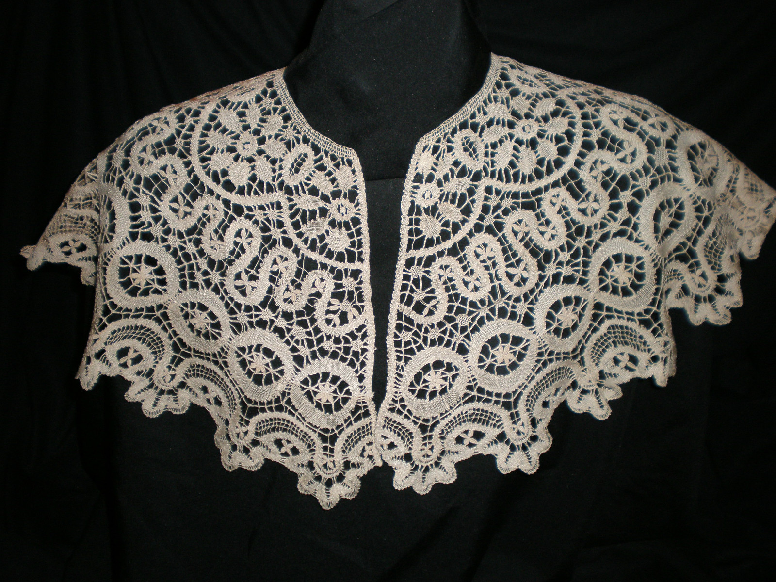 Comments: A guipure bobbinlace deep collar. Could be French from around Le Puy, or maybe a Russian product, with the ‘sunflower’ design. Well done, quite a bold design. This type of lace needs research. Looks in generally very good condition.