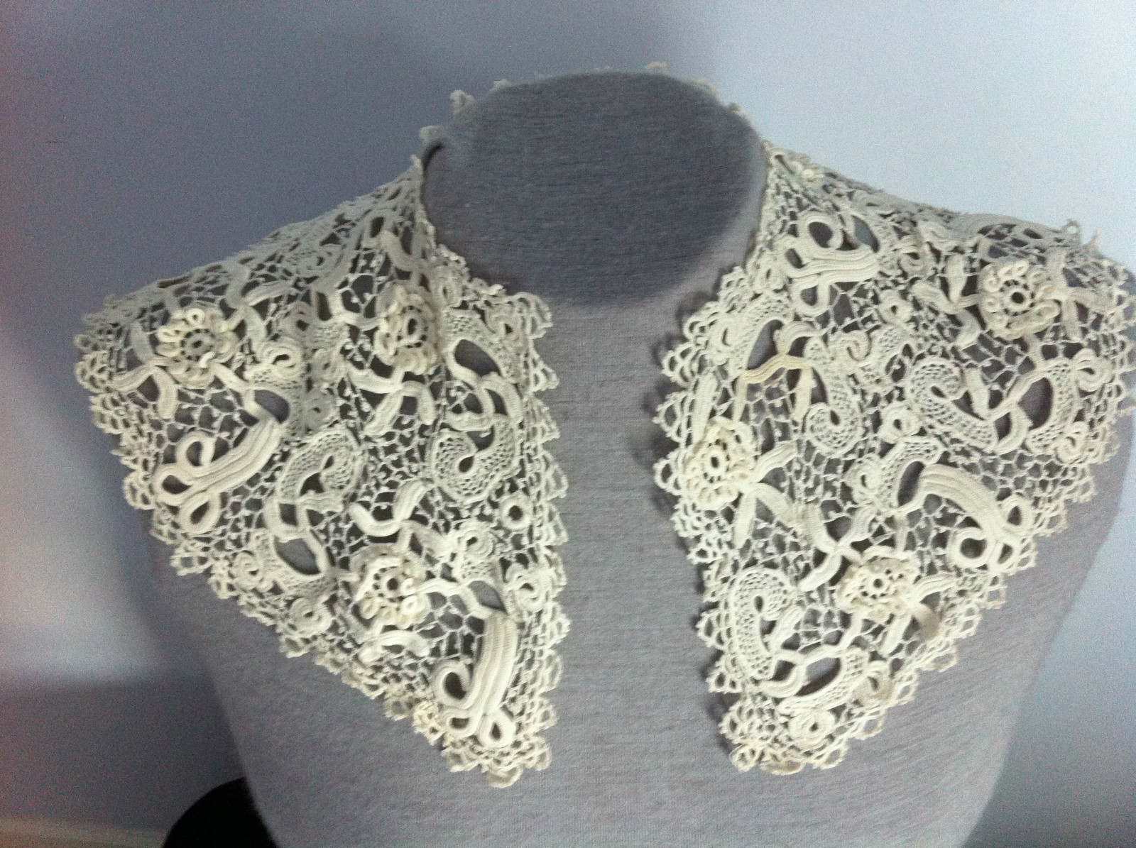 Comments: An collar of Cantu bobbinlace. Interesting little plaited edge running along the outside. Typical flower and hook motifs, design symmetric and lays on the manikin well. Basically good condition from the photos, although there’s no image of the back of the piece.