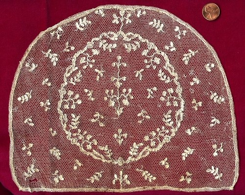 Comments: A cap back of Alençon lace. The piece has the bride bouclé ground, which is a very complex ground composed of three separate layers of stitches. Each side of the hexagonal mesh is buttonholed over giving this the strong, ‘winter lace’ texture. Both Alençon and Argentan manufacturers used this mesh, so it is basically impossible to attribute. The design is quite typical of the late 18th century. Condition is short of good, with numerous repairs and some small holes in the lower left corner.
