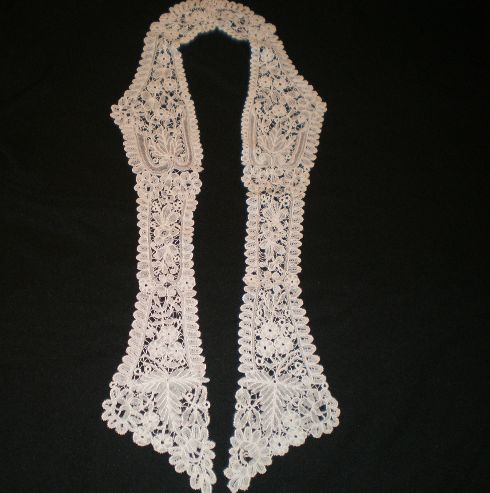 Comments: A lappet collar of Duchesse, on the Bruges side in design. No needlelace accents. Typical motifs, well arranged. Looks in very good condition.