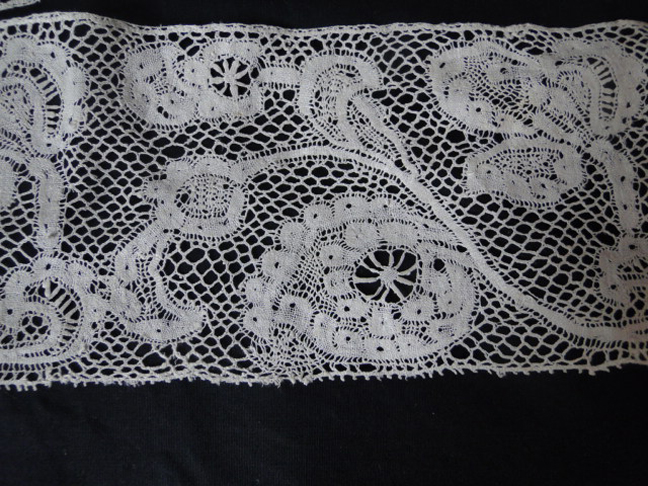 Comments: A narrow border, hard to say if it’s Flemish or Milanese. It does have a Milanese plaited ground, yet the delicacy of the motifs look more Flemish. So does the very plain lower border. Wish there were more closeups, and a view of the opposite side. But I think I will go with Milanese on this, mainly because of the woven leaves used as fillings. Overall good condition, just looks a little worn.