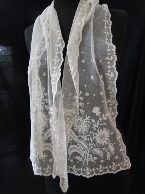 Comments: A rectangular shawl of tambour embroidery on machine net. It has a nice ‘blonde de caen’ look with large flowers massed at the ends, and delicate esprits in the ground. Basically very good condition, one small opening and some age stains.