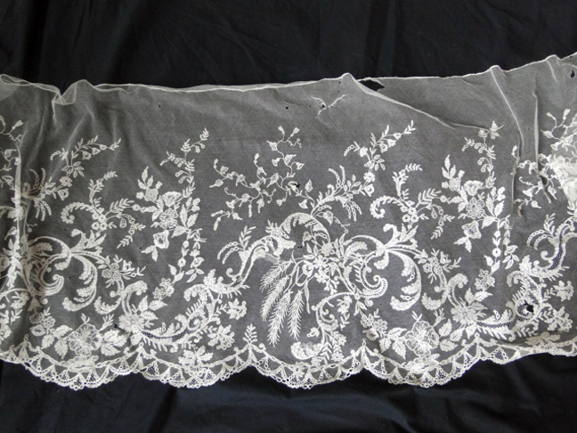 Comments: A wide flounce of Brussels bobbinlace application on machine tulle. Interesting wheat ear design. It’s a complex design, no esprits in the upper ground. A longer piece of this lace sold on Ebay recently, #160981816141. Condition on this is basically good, with some holes scattered throughout the tulle. Expected in this kind of lace.