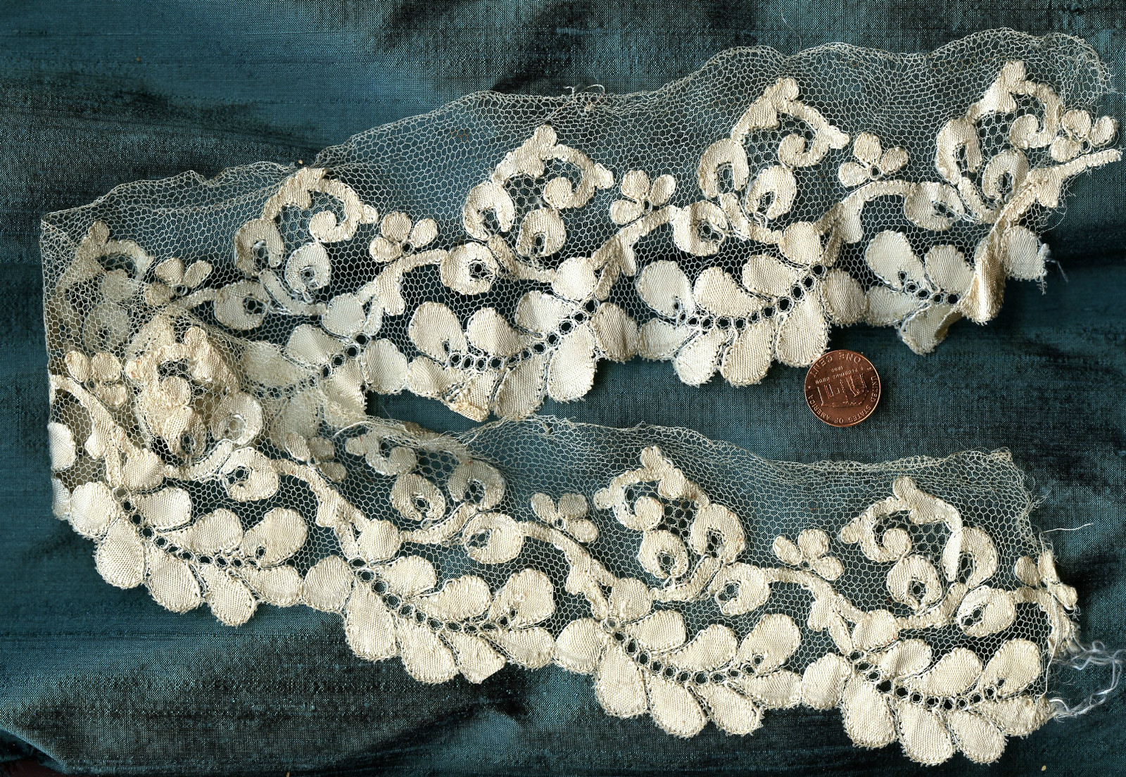 Comments: A pieced lace that is more a broken up tape lace than a true pieced lace. It does look like a later 19th c piece, and the trefoil flower heads could have originated in Italy. But a Bruges product is not out of the question, especially with the picoted brides and single woven tally fillings. Seller cites a few age marks, and I don’t see any obvious damage from the photos. Basically very good condition.