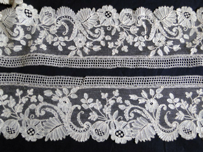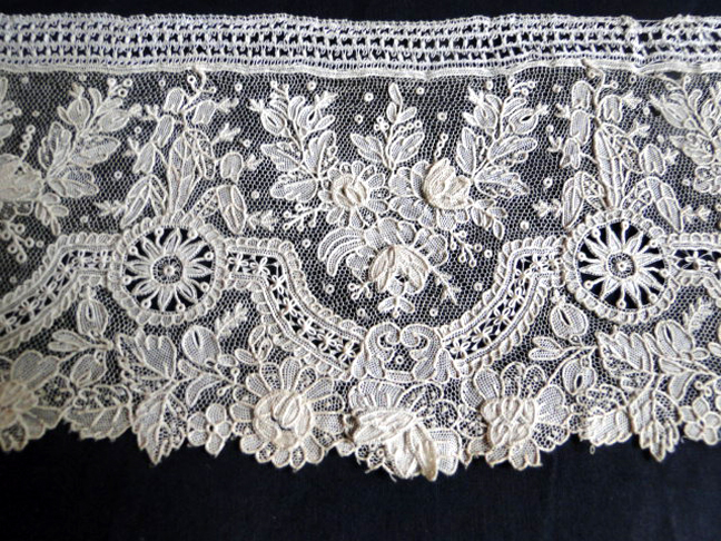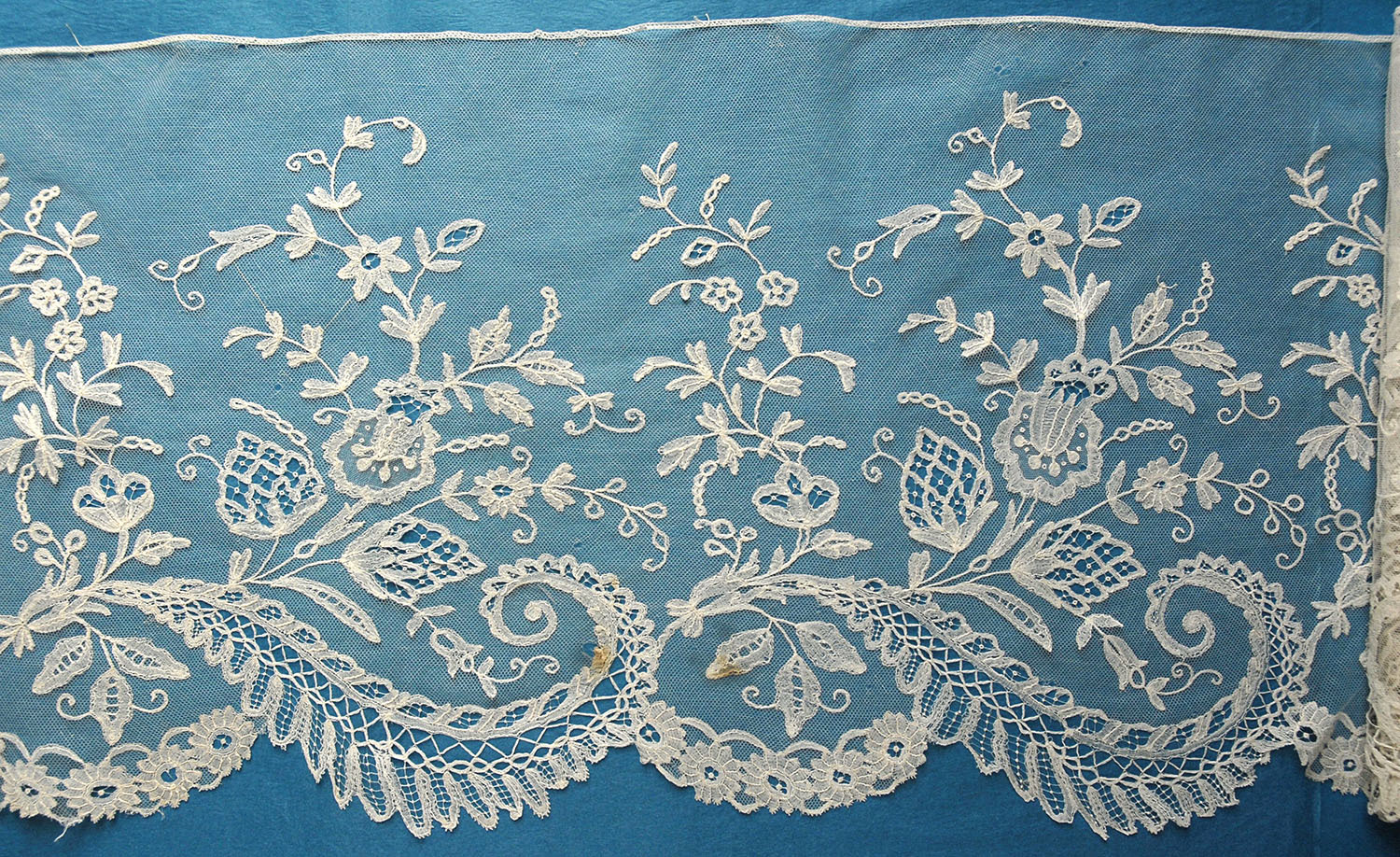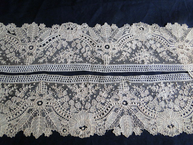 Comments: A Point d’Angleterre border – fine bobbinlace motifs with a Point de Gaze needle-made ground. It also has some good needle-made ring fillings in the motifs. Naturalistic design, well executed. This is one of the better products of the later 19th century Belgian laces. Looks in generally very good condition from the photos.