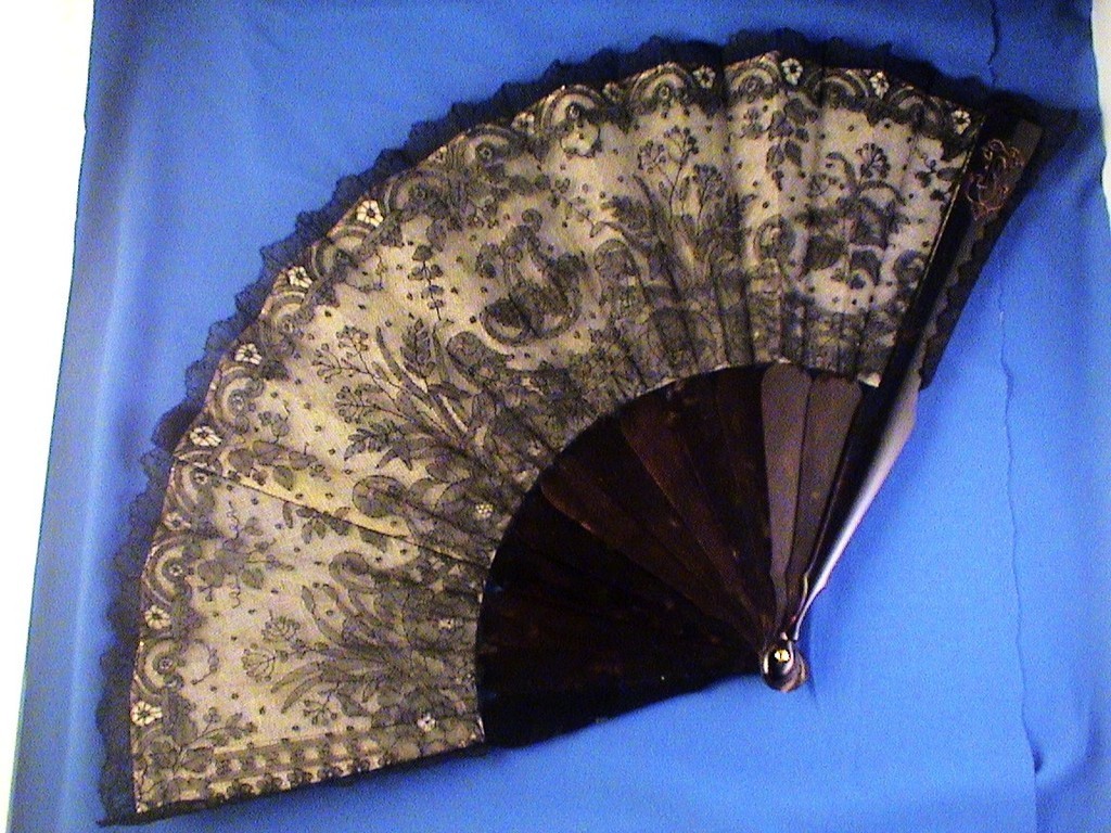 Comments: A Chantilly fan with faux tortoise-shell sticks, monogrammed. Seller says they are Bakelite, I don’t know how to recognize that material in a fan. The lace also seems to have the same monogram, and the design is a bit skewed with the monograph off to one side, interrupting the symmetry. The lace and sticks are in generally very good condition, the silk backing is split.