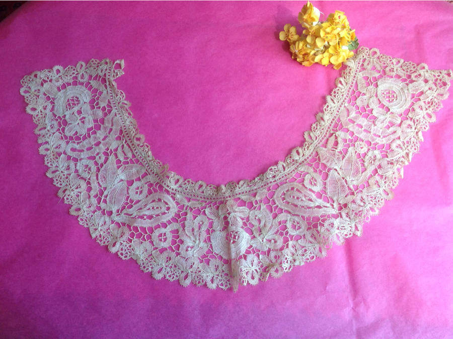 Comments: A collar of Honiton point lace, meaning Honiton motifs with a needle made ground. This is a later development in Honiton lace. The motifs are large, snails/slugs esthetic, a bit loosely worked. Woven tally fillings. Generally good condition, a few broken brides and small repairs.