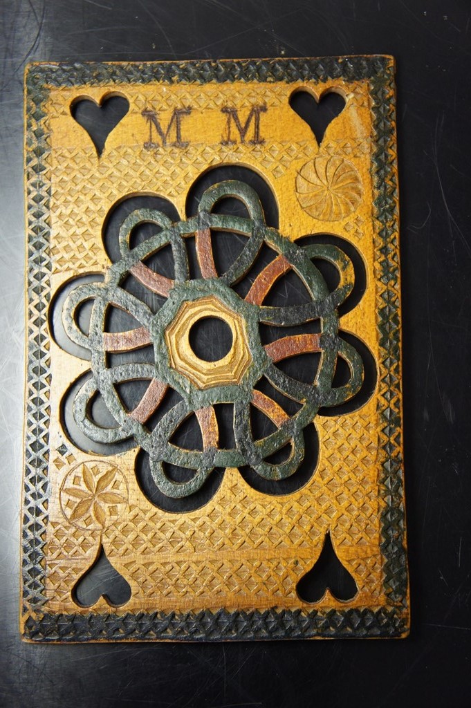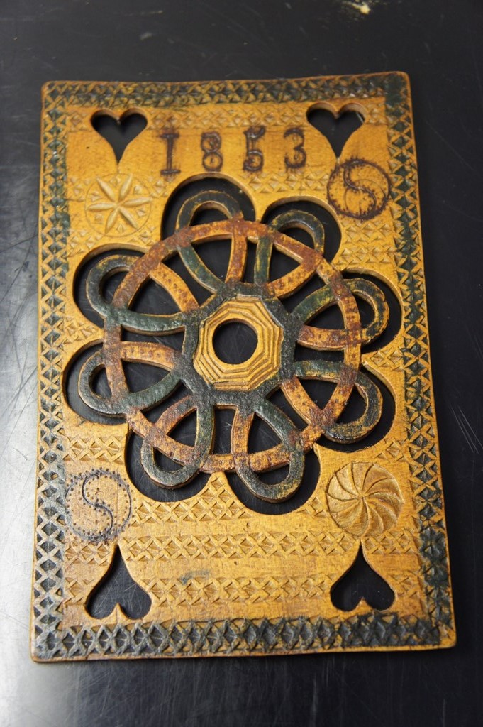 Comments: An impressive looking dated Plior, seller says it is from Auvergne. It has both a chip carved surface and pierced work. Much of the original paint remains. Now I’m assuming this is an authentic item, I’m not an expert here, but buyer beware on French primitive wood antiques. For me the jury is perpetually out on things like this, but I have to admit, it looks great and is in very good condition.