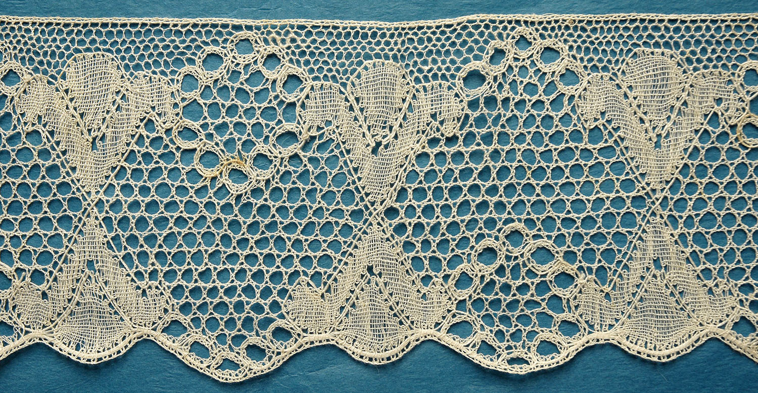 Comments: A later 18th c Valenciennes round hole mesh border. It has a light, fine design, finer than it looks at 1.5″ wide. One of my favorite laces. This one has a few stains, and some localized breaks along the top edge. Generally good condition.