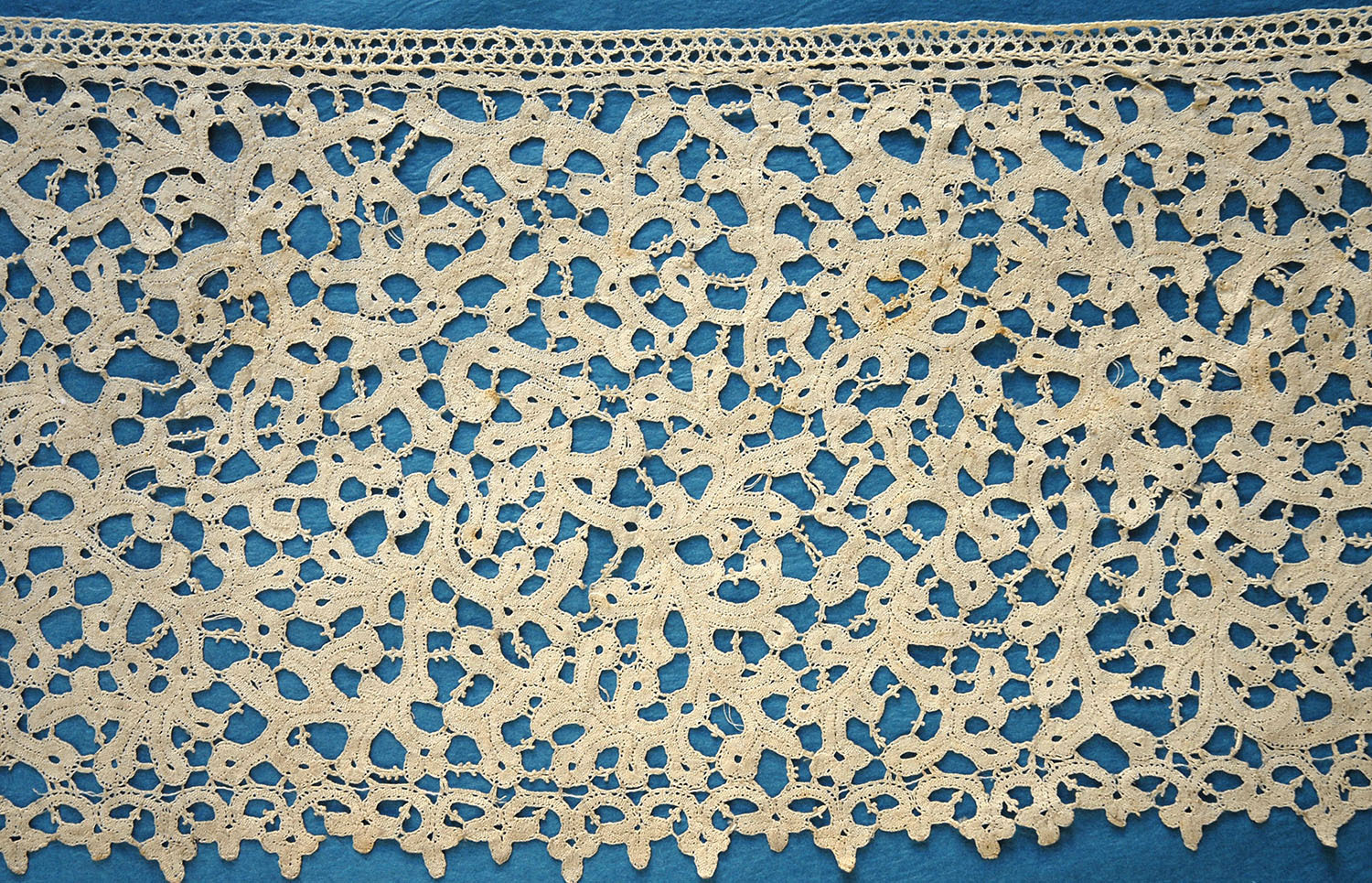 Comments: An interesting tape lace, with the tapes doubled back to form the trail. Well done header and lower edge of similar bobbinlace. Picoted double brides. Technically it isn’t a complex lace, and could have been made over a wide time range, late 17th into the 19th c. Probably Italian Milanese genera. A little stained, no obvious damage, basically very good condition.
