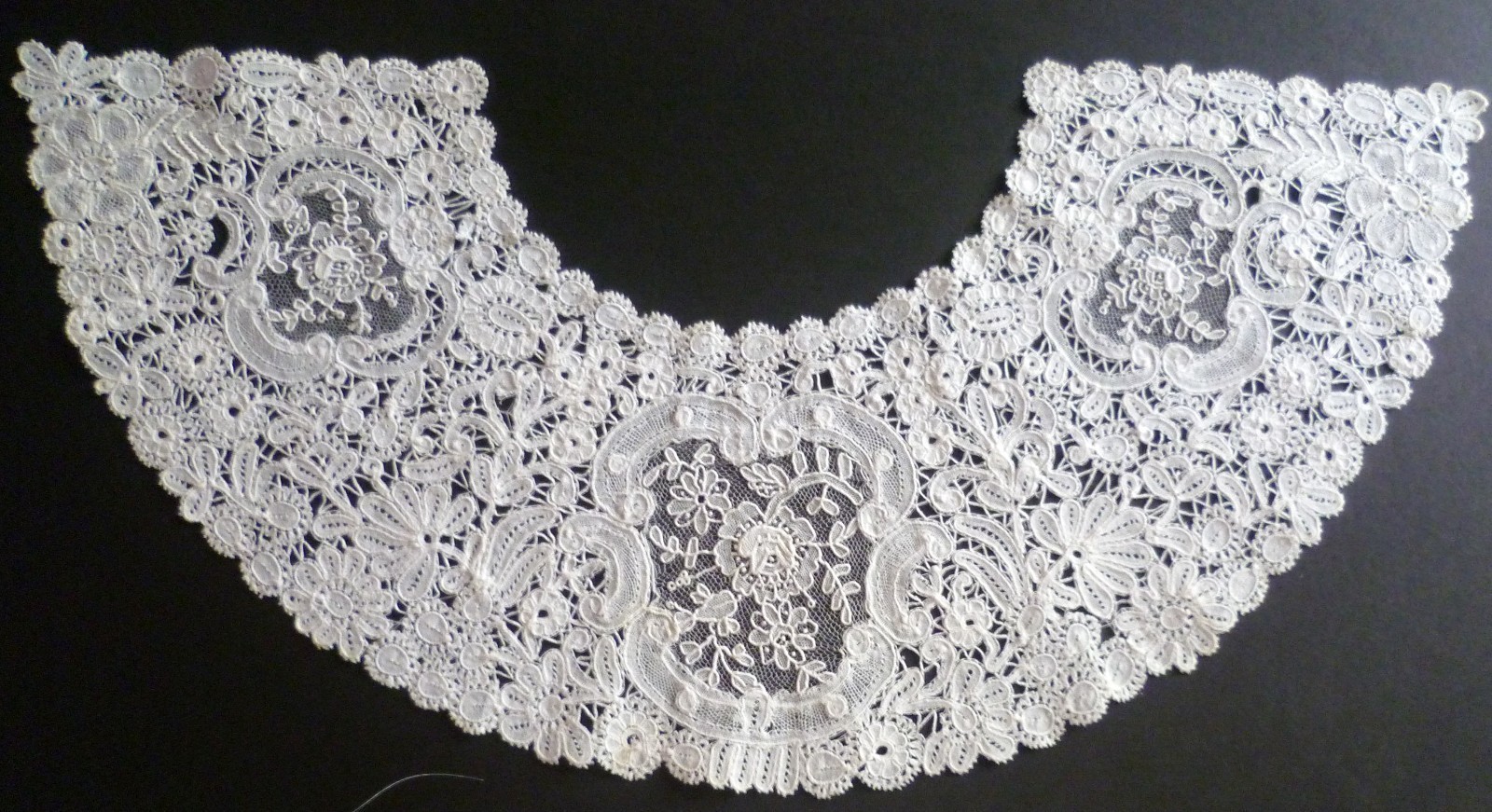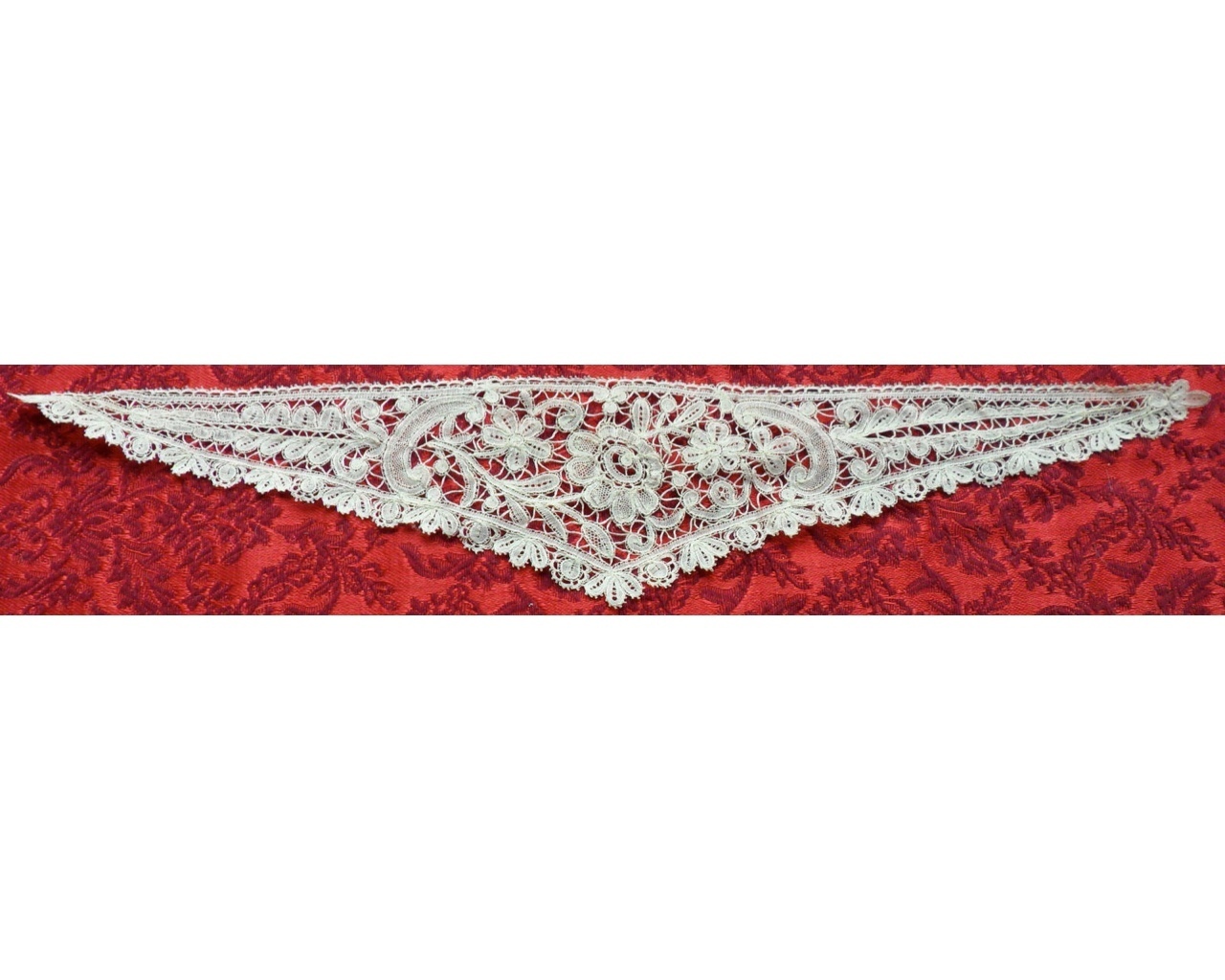 Comments: A narrow triangular piece of Belgian Duchesse de Bruges. Could be a collar or neckpiece, I’ve never seen this shape before. No raised work, no needlelace ornaments. Irregular brides, no picots. An interesting piece, in generally very good condition.
