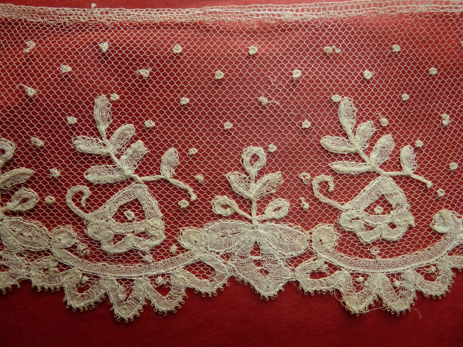 Comments: A border of bobbinlace application on machine net. A simple design with lots of esprits in the main ground, I think these are just embroidered on. No needlelace accents that I can see. Basically good condition, some pinholes, edge damage according to the seller, but no detailed photos of defects.