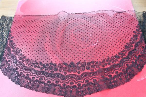 Comments: A border of black silk Chantilly lace. A short repeat of large flowers with honeycomb fillings, leaves above, a few esprits in the ground. The condition looks generally very good, looks unused.