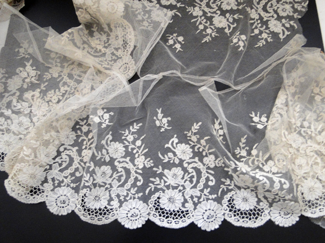 Comments: A wide flounce of Brussels application on machine net. No raised work in the motifs, but they are quite finely done and really don’t need it. Note the interesting needlelace picoted brides used as fillings, also the needlelace flower decorative stitches. Excellent technique, a short repeat, no extensive esprits in the ground, just one row of sprigs. Probably a late 19th century piece. Some pinholes and a few small openings, basically very good condition.