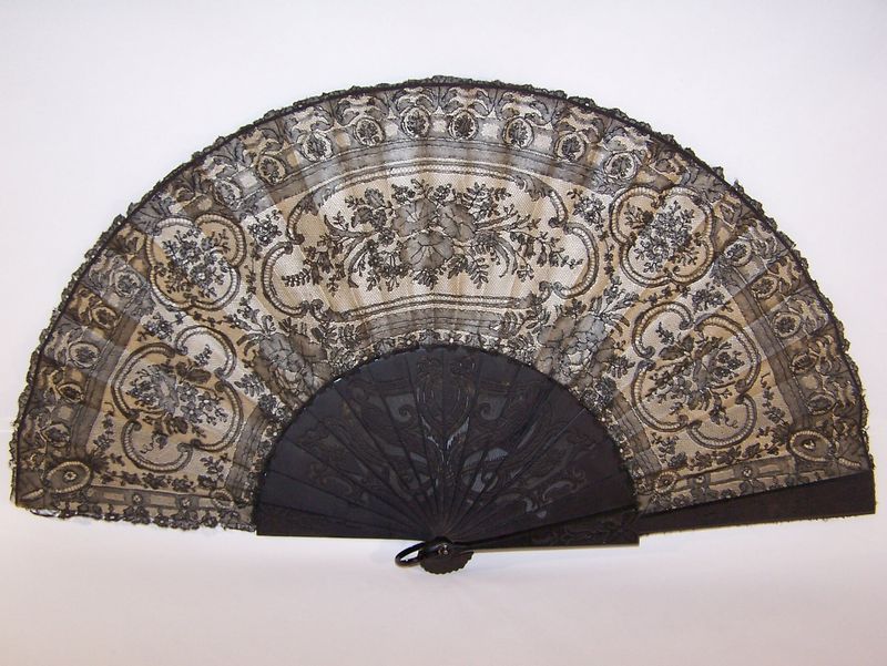 Comments: A Chantilly fan with black wood sticks, elaborately carved, one broken. The lace is impressive with well defined cartouches. The condition of the lace is generally very good, no doubt helped by the cream silk mount. Silk background against silk lace, not too bad for long term stability. Still, it helps to maintain temperature and humidity stability.