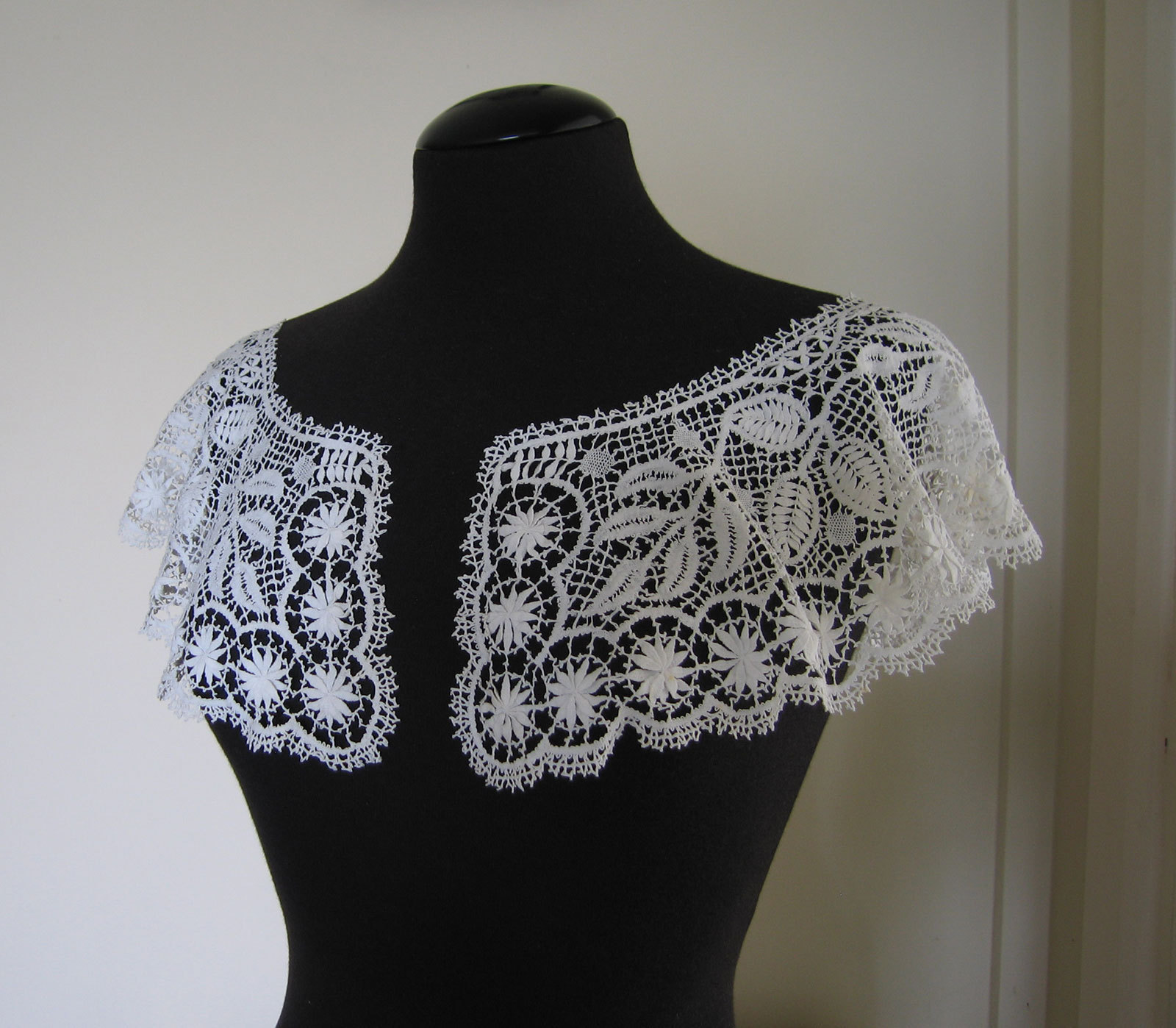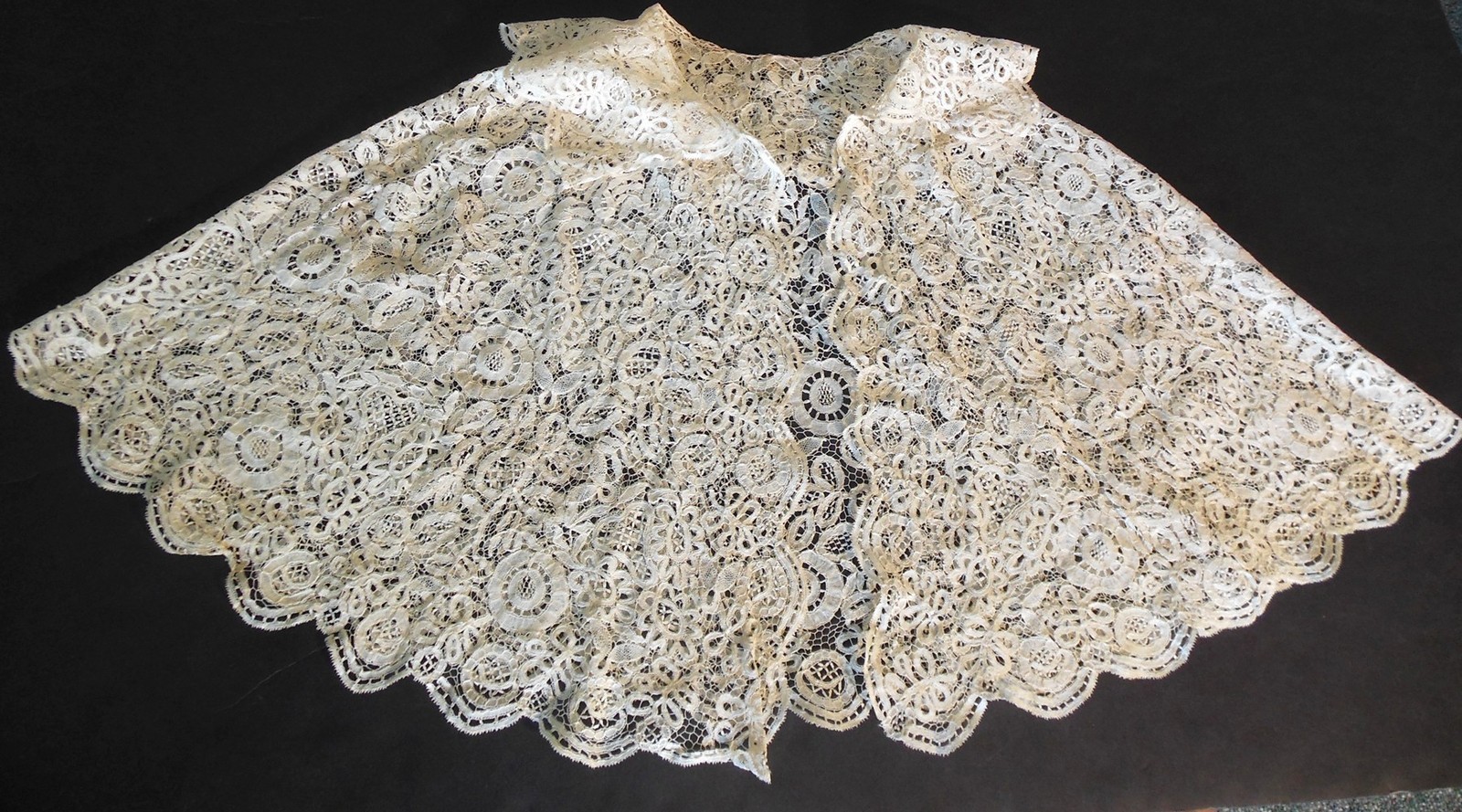 Comments: An interesting caplet of Honiton Point lace, meaning honiton motifs with a needle-made ground. Seller says ‘acquired from the MET’, probably a de-accession. Snails/slugs esthetic, actually quite well executed, motifs quite crisp.. Honiton Point is a later lace, end of the 19th c. A variety of good tally fillings. The design is fairy scattered, the English Flower Garden concept. I can’t see the details of the collar attachment, so am not sure if anything is cut. But basically is looks in very good condition from the photos.
