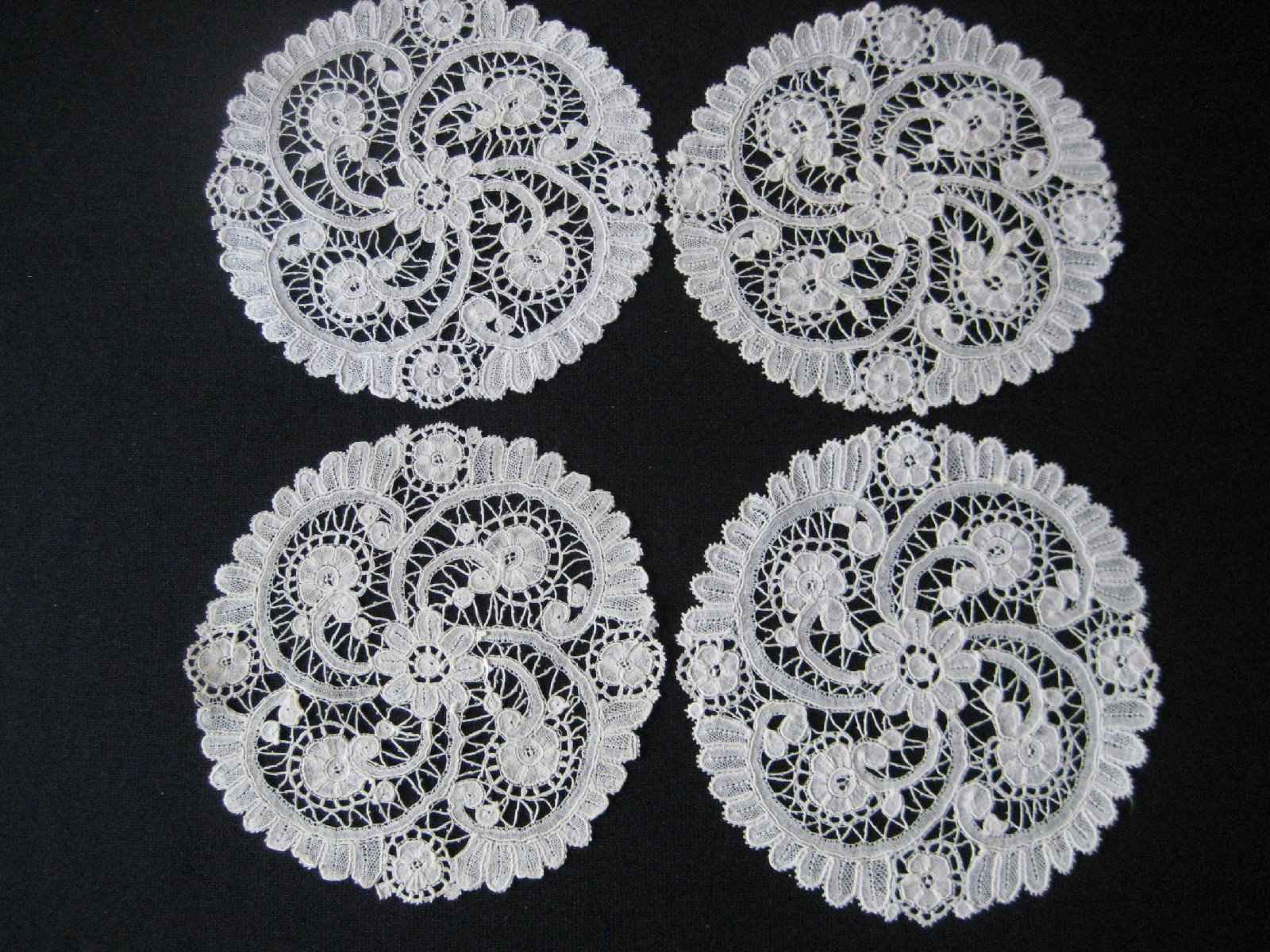 Comments: Four little doilies or coasters of Duchesse de Bruges. Table linens are a specialized lace collecting area, and Duchesse isn’t often made in such forms. All four look in generally very good condition, look unused. Nice design for the form, well made.