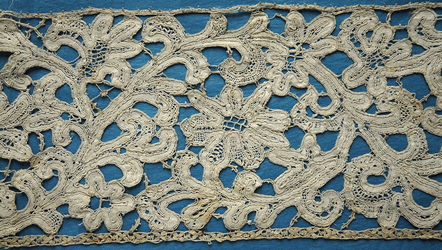 Comments: A tape lace, looks Italian, but a little off in technique for Milano. Note the heavy gimp which is atypical, and the short picoted brides, which you do sometimes find. The way the cloth decoration and fillings are handled all speak to a possibly later piece, perhaps 19th c? This one is a mystery, but indications do point to Italy. It is rather soiled with general wear and repair, basically good condition. Very interesting.