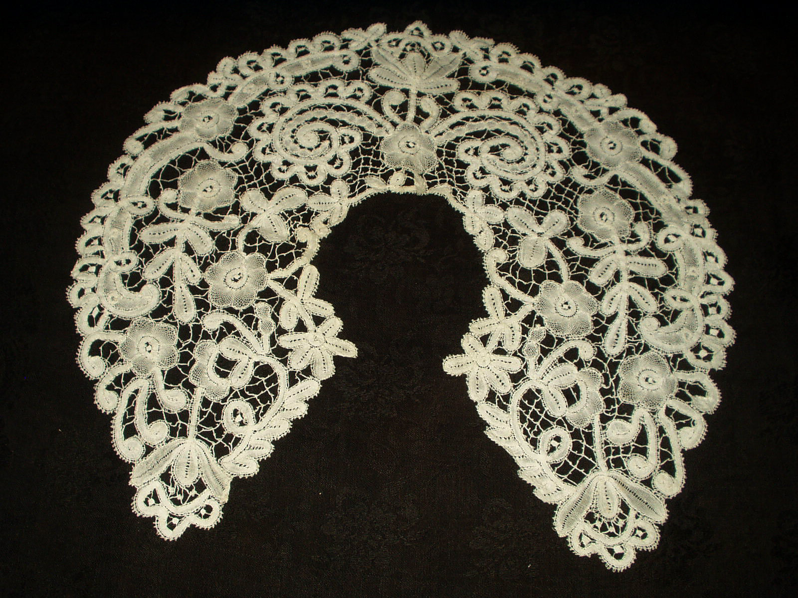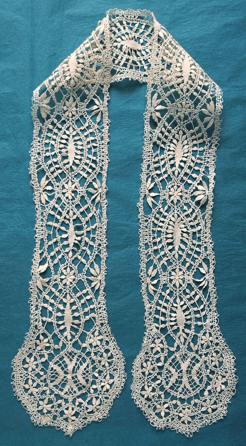 Comments: A collar of Bruges Bloemwerk good technique, symmetric, and in generally very good condition. Some raised work against a halfstitch ground. It is quite a bold, pleasing design.