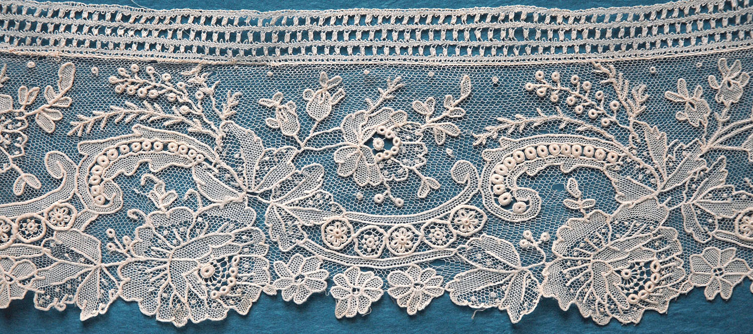 Comments: A narrow Point de Gaze border. No raised work, but the quality is very good. Note the spiky picots, mark of a specific (unknown) manufacturer. For a small pieces the design is good, and note the very heavy ring ‘mode decorations’. A few small holes and some repairs, generally good condition.