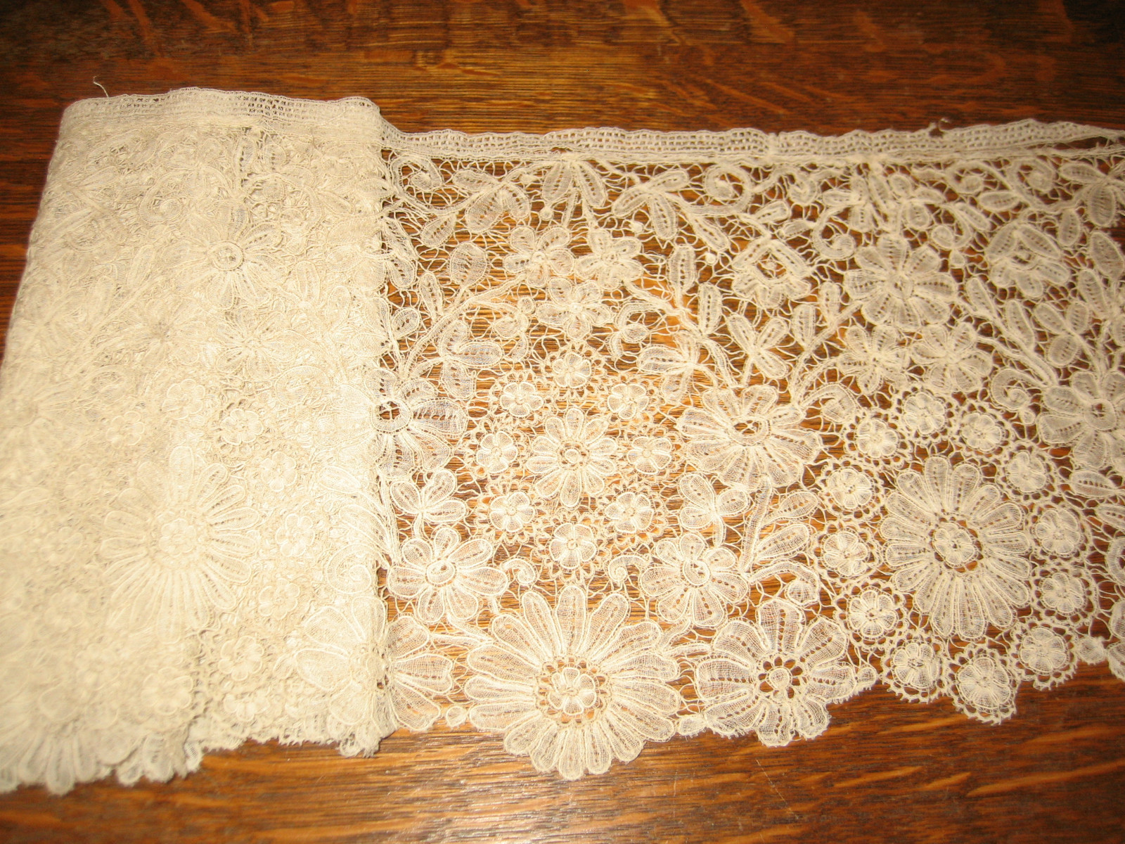 Comments: A fairly wide border of Duchesse de Bruges, approaching the style of Bloemwerk, but not quite there yet. All the flowers are quite simple and symmetric, but the whole thing combines very well in design. Seller cites a minor break, a few loose spots. Basically very good condition.