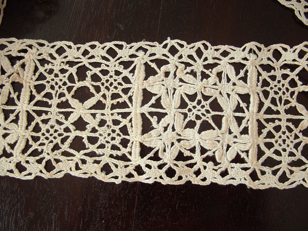 Comments: A narrow tapelace border, perhaps Northern Italian or Eastern European. Good colorful design (I often find white laces are so well decorated that you can almost see color) with decorations in the tape and halfstitch in the leaves. Looks in generally very good condition from the photos.