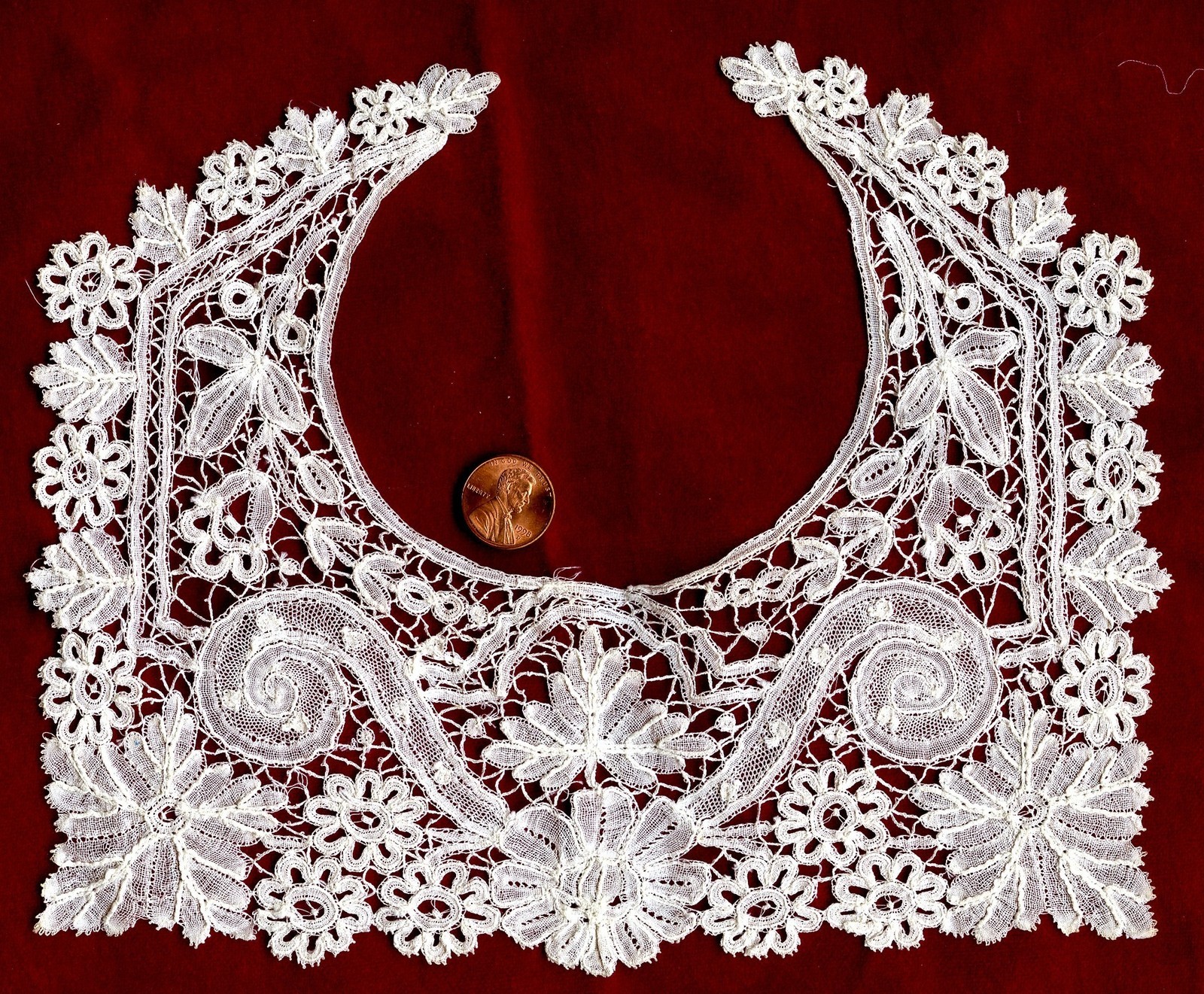 Comments: Very difficult to see the details of this piece since it has been photographed on white. It appears to be a Point de Gaze collar with raised petal roses. Some decorative ‘mode’ fillings. I can’t tell much about the condition because of the contrast in the photographs. But I’ll guess generally good.