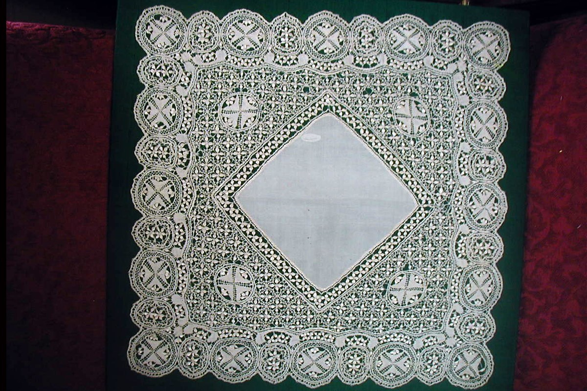 Comments: A Maltese handkerchief. It is sewn on a green board, I don’t know if the backing is acid free. Probably best to remove. The piece is a three layer construction – outer alternating Maltese crosses and flowers with a good guipure on the inner border. Middle has Crosses against an interesting woven leaf ground. The inner border is simple crosses of woven leaves – I think it is made along with the middle section. There are some missing woven leaves in the middle ground – unusual damage for a piece like this and difficult to fix. A patch repair to the center silk. Basically good condition.