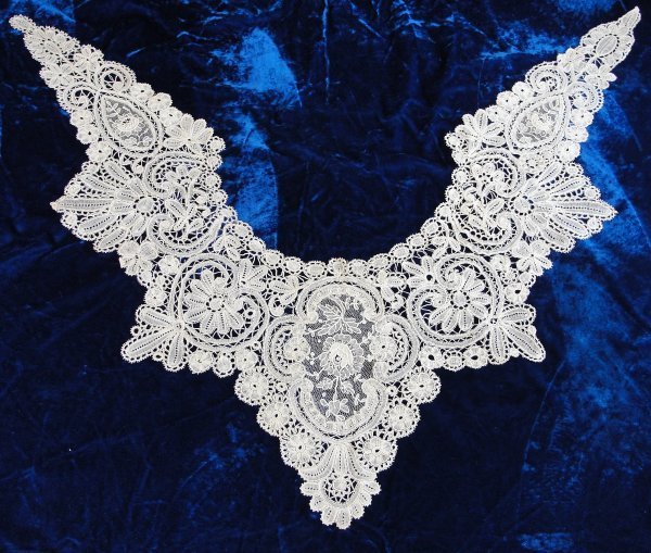 Comments: A collar of Duchesse de Bruxelles, probably meant as a dress front – no point in putting the Point de Gaze in the back. Raised petal rose in the needlelace. The bobbinlace is a little on the Bruges side, little raised work, but nicely done. Crisp, clean design, very appropriate to the form.