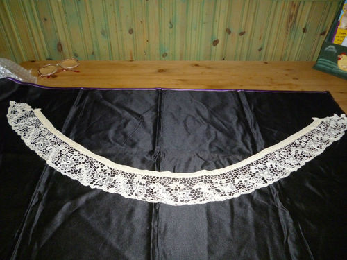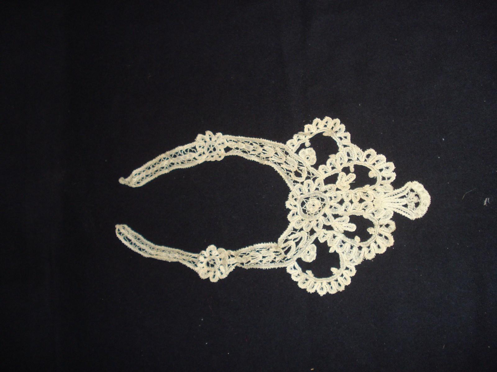 Comments: A border of Youghal needlelace which looks to have been used as a collar. Short repeat, typical Youghal combination of dense and light clothwork. No elaborate fillings.