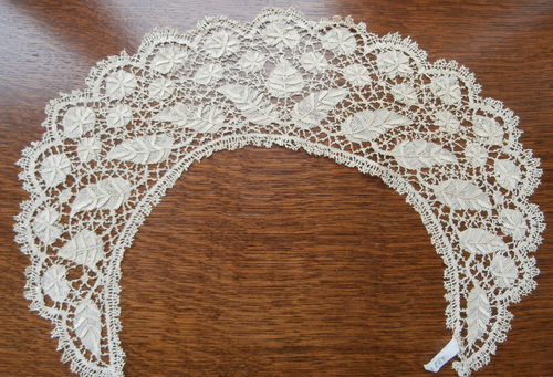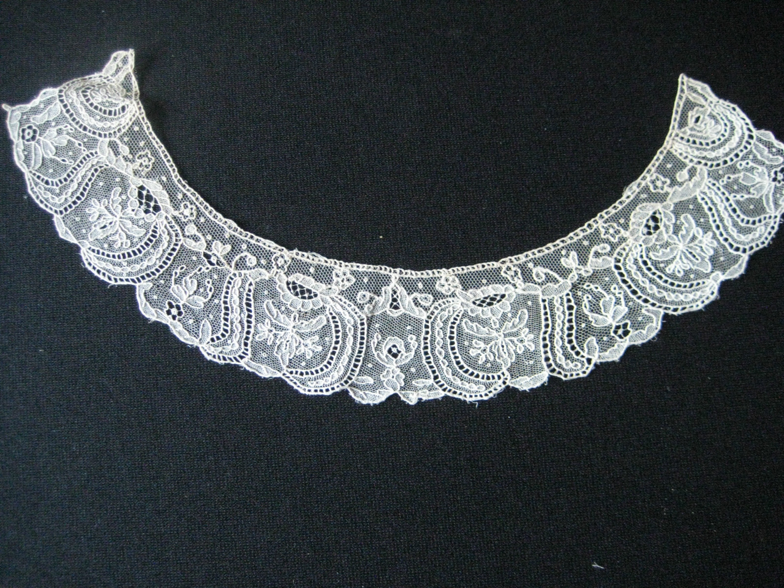 Comments: A very small, light Point de Gaze collar. No raised work, minimal decorative ‘mode’ fillings. No raised work.