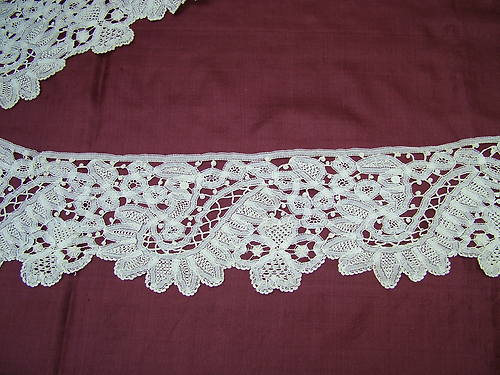 Comments: A long, reasonably wide collectible Duchesse de Bruxelles flounce. No raised work in the Point de Gaze needlework. Plenty of raised work in the bobbinlace, rolled edges and raised areas above halfstitch. This is a good tight design, a little on the Bruges side in a good way.