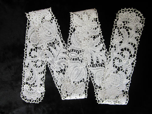 Comments: A little ‘necklace’ of Bruges bloemwerk. These come up occasionally and vary a lot in the quality of design. This one uses bloemwerk techniques, fairly standard motifs arranged in a good pendant design. Wish there were more of these around, they can be quite charming.