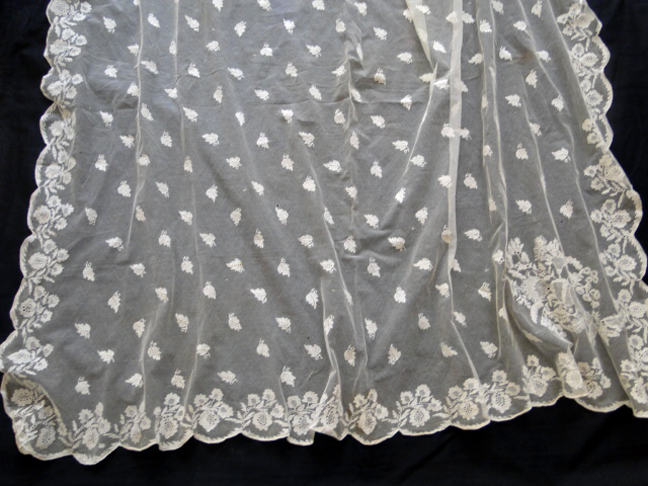 Comments: A rectangular veil or shawl of tambour embroidery on machine net. The borders and corners are heavily embroidered with many sprigs used as esprits in the main ground – which is a lot of extra work.