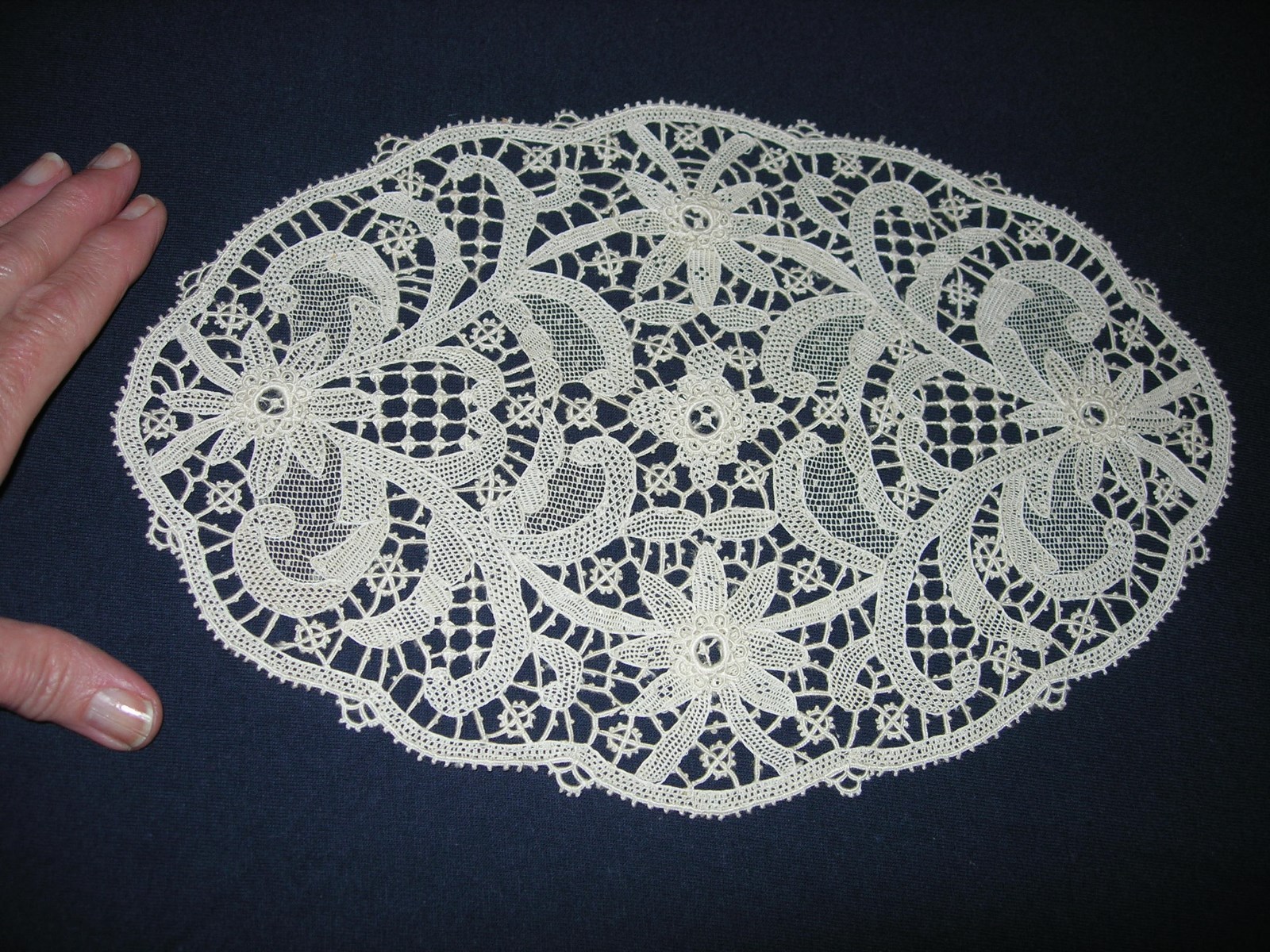 Comments: Seller says this was purchased in Venice in 1984, as a Burano needlelace. Years ago I visited the Jesurum store in Venice and spoke with the current Moreno owner. He gave me a fragment of ‘rosepoint’ which looks very much (although more elaborate) like this piece, but definitely the same technique. He told me how workers were selected for their hand characteristics to do the different stitches.