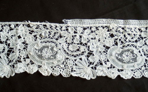 Comments: A Brussels Duchesse border. No raised work on the Point de Gaze inserts. The bobbinlace is a bit on the Bruges side, a few raised pieces on halfstitch ground.